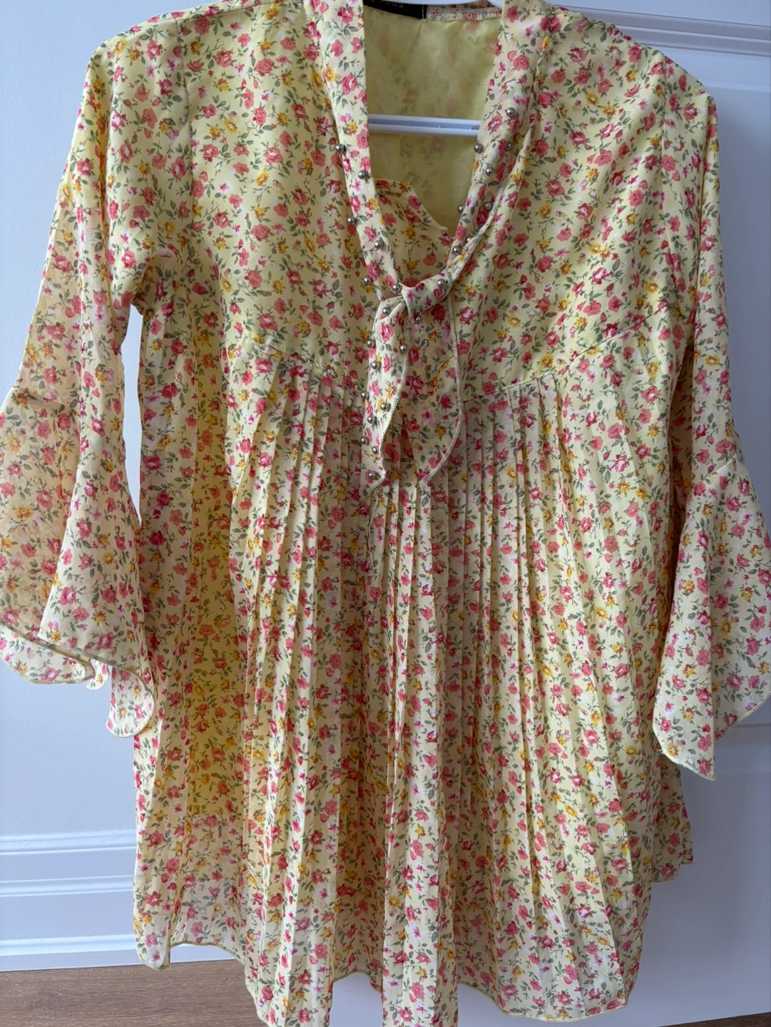Lightweight yellow blouse. Features a pleated bodice, bell sleeves, and a tie neckline with decorative studs. Floral print throughout. Looks great with jeans or a skirt.