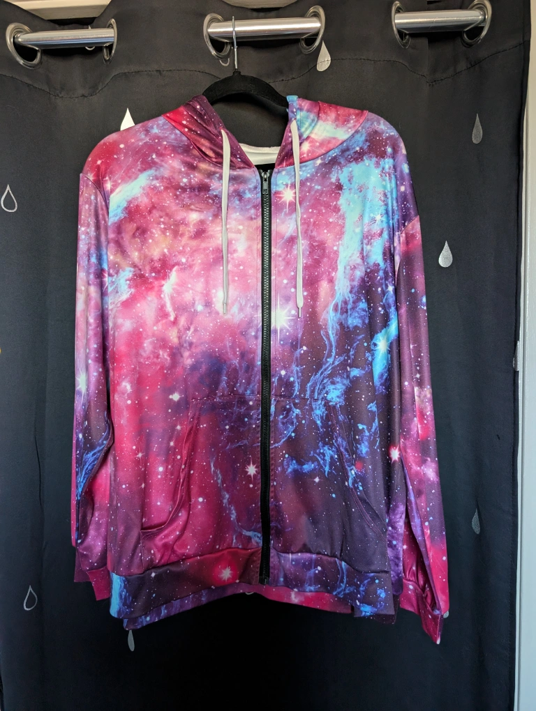 356Women's zip-up hoodie. Features a vibrant galaxy print. Long sleeves. Great for casual wear. Polyester Material (Cat Friendly Home.)