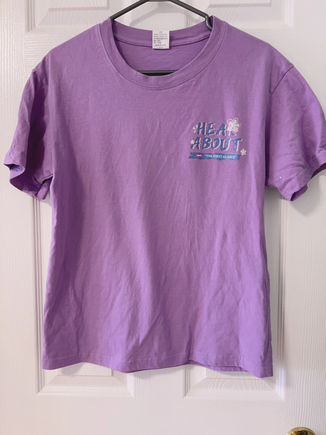 No tag, worn once. Cute lavender t-shirt. Features a graphic on the front and back. Short sleeves. Relaxed fit. Brand tag attached.