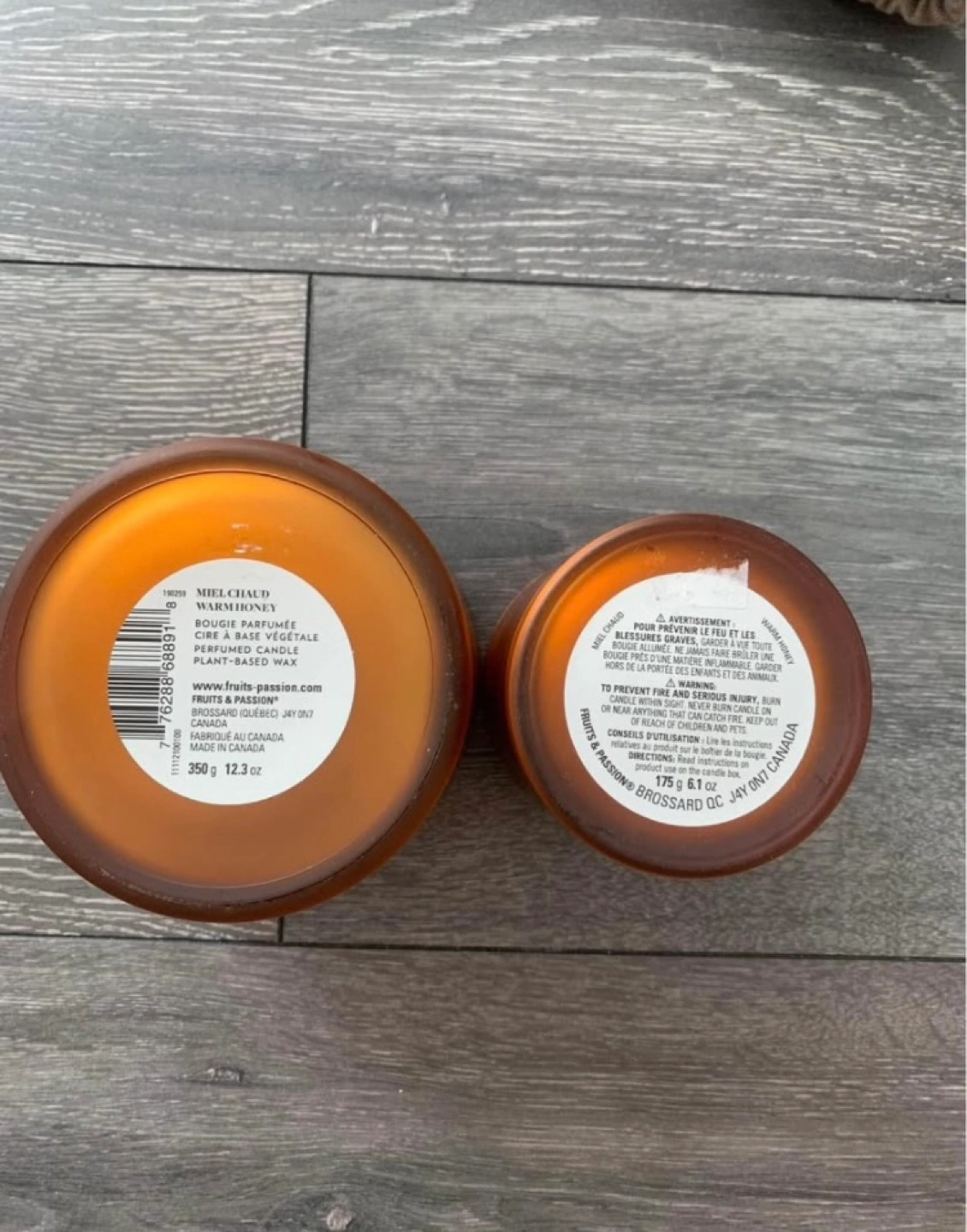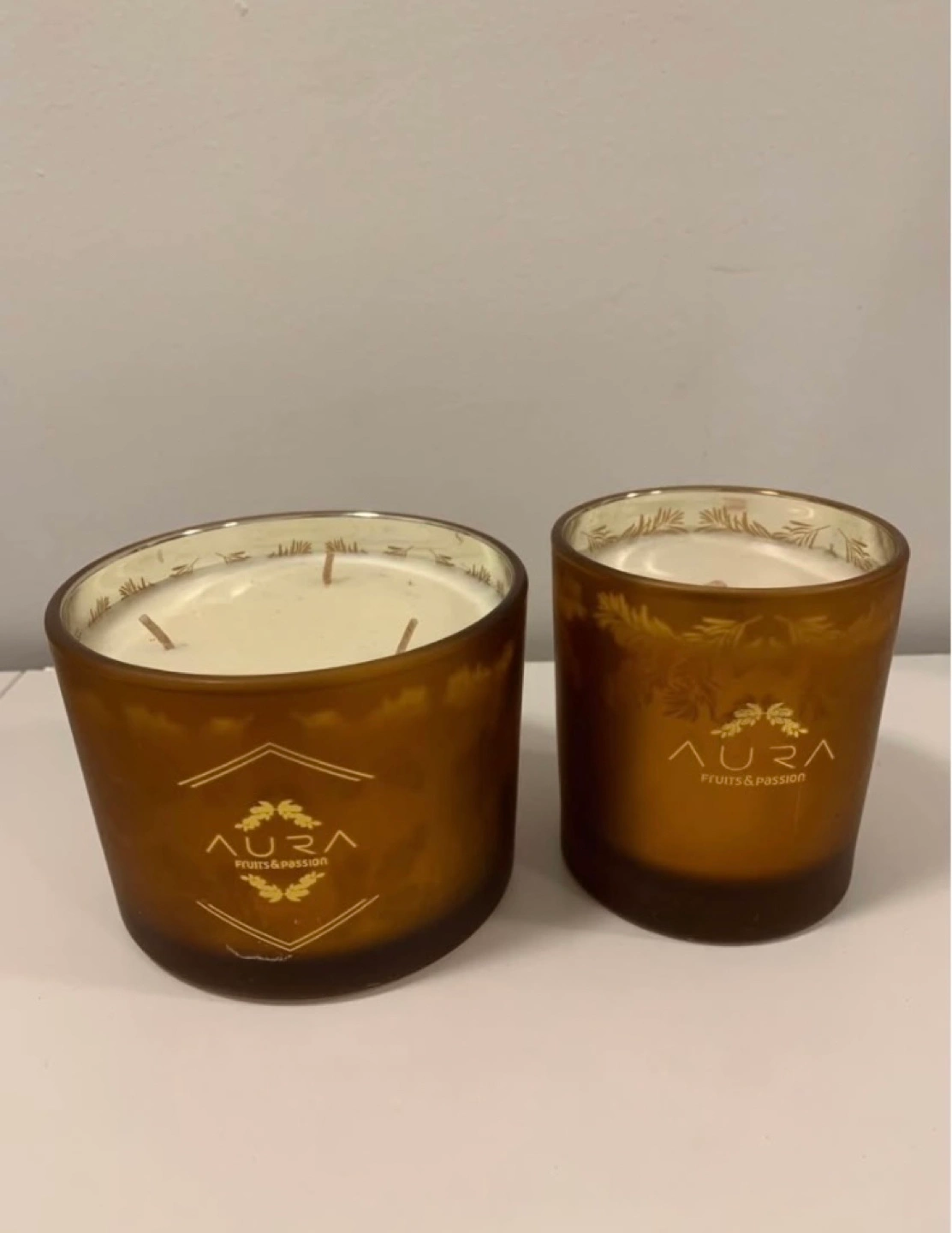 -Two Aura Fruits & Passion scented candles. Amber coloured glass jars. One larger, one smaller. Includes a small fabric bag.