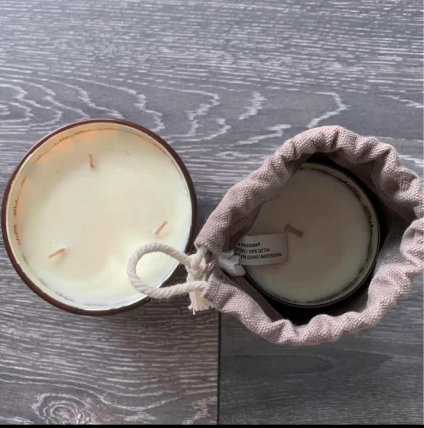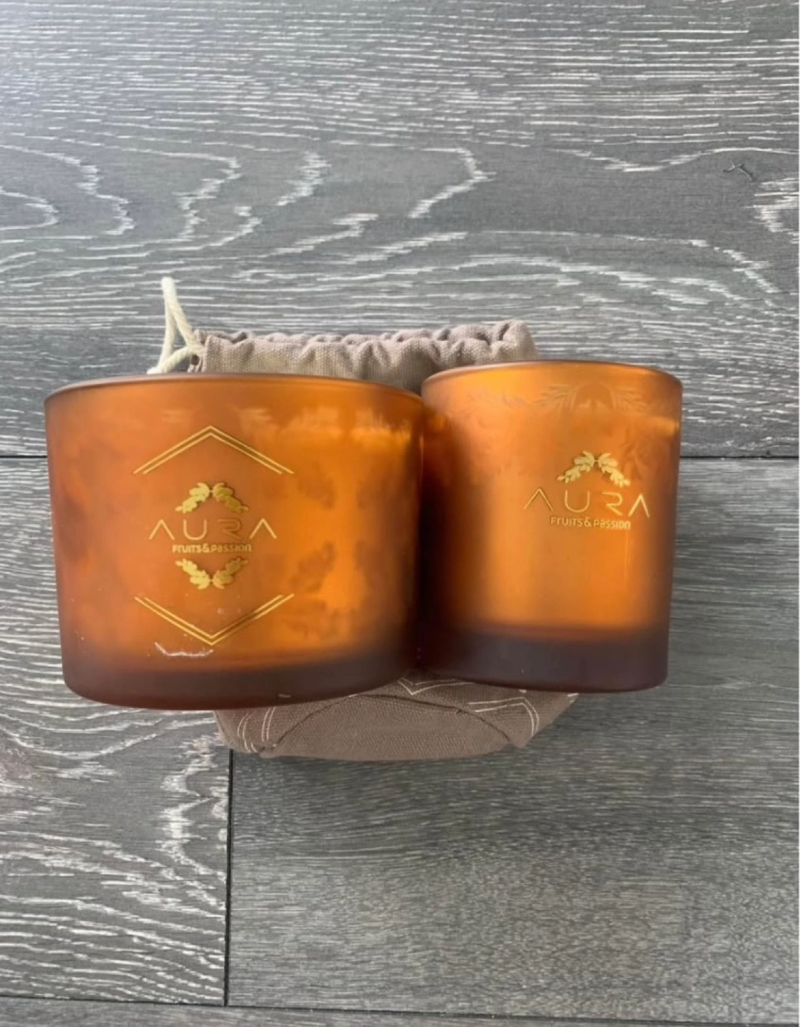 -Two Aura Fruits & Passion scented candles. Amber coloured glass jars. One larger, one smaller. Includes a small fabric bag.