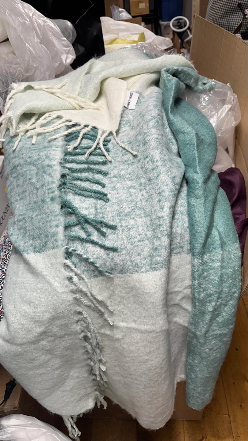 Beautiful throw blanket. Features a soft, fuzzy texture. Mint green and white colour block design. Fringe detailing.