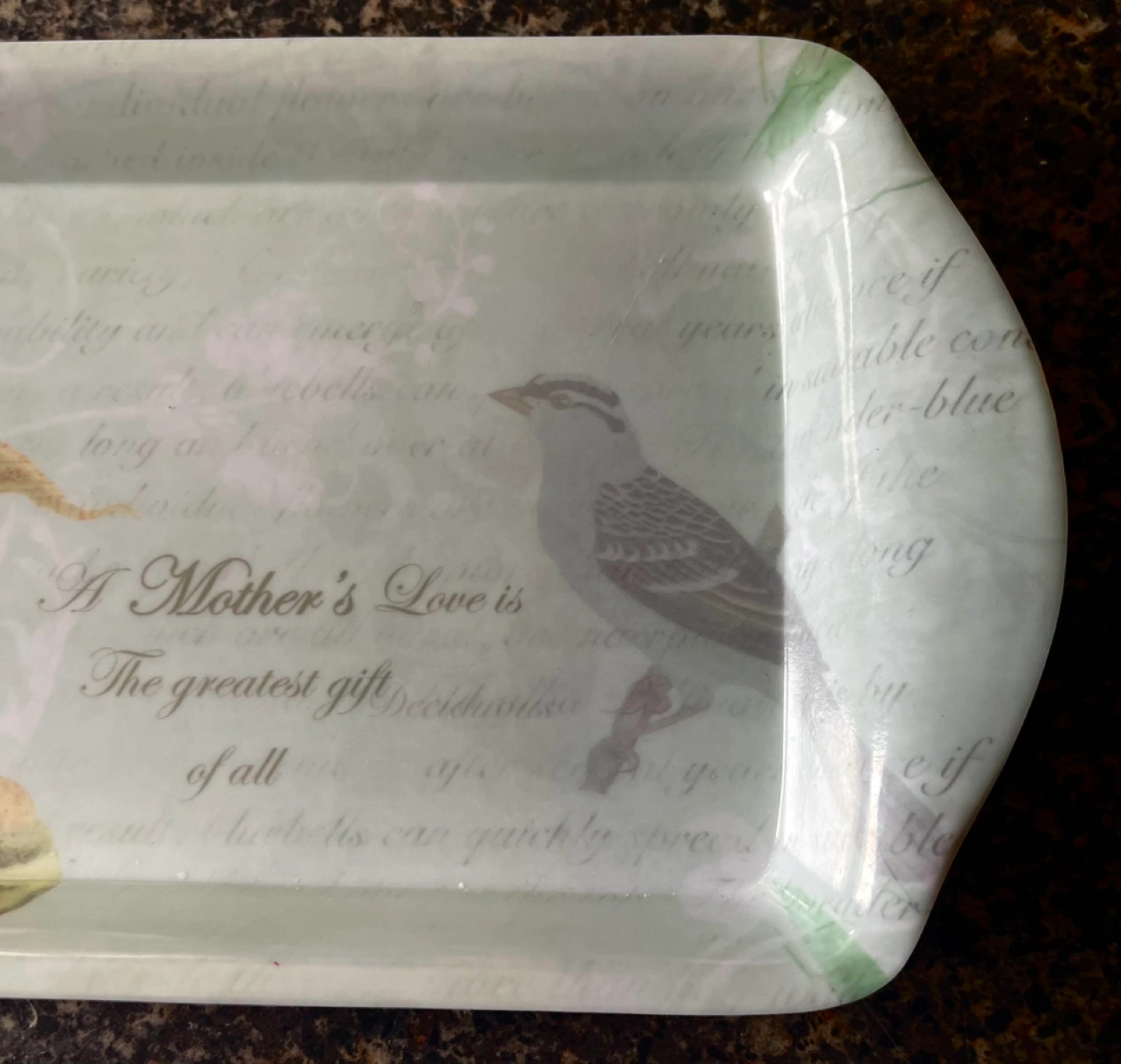 Rectangular serving tray. Features a large pink rose and a small bird. Pale green background with a quote about a mother's love…..