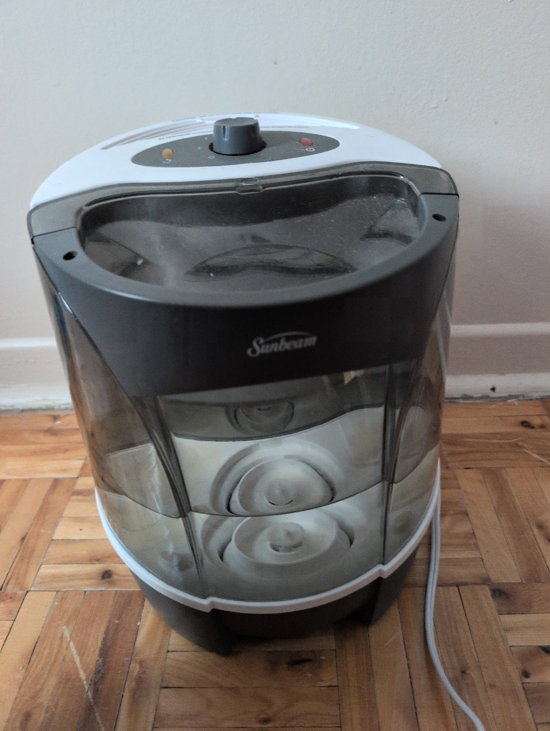 This Sunbeam filter-free warm mist humidifier is designed for small rooms. It offers adjustable humidity output and a medicine tray for aromatherapy. The unit automatically shuts off when empty. Light used and ready for a new home. Comes in it's original box.
