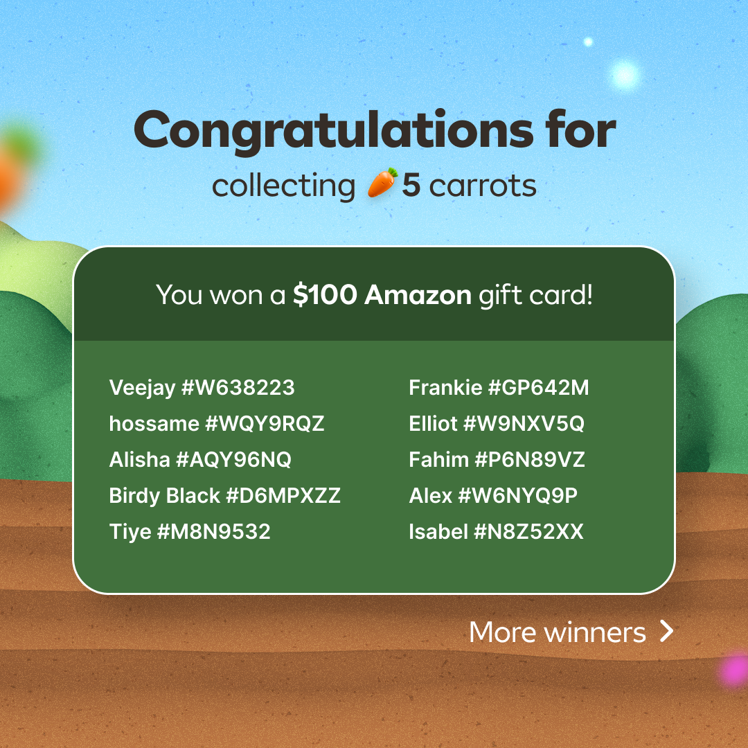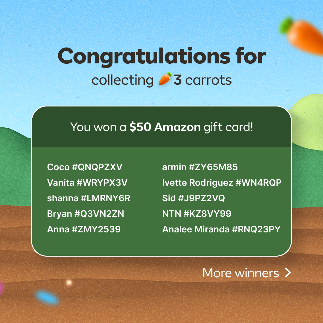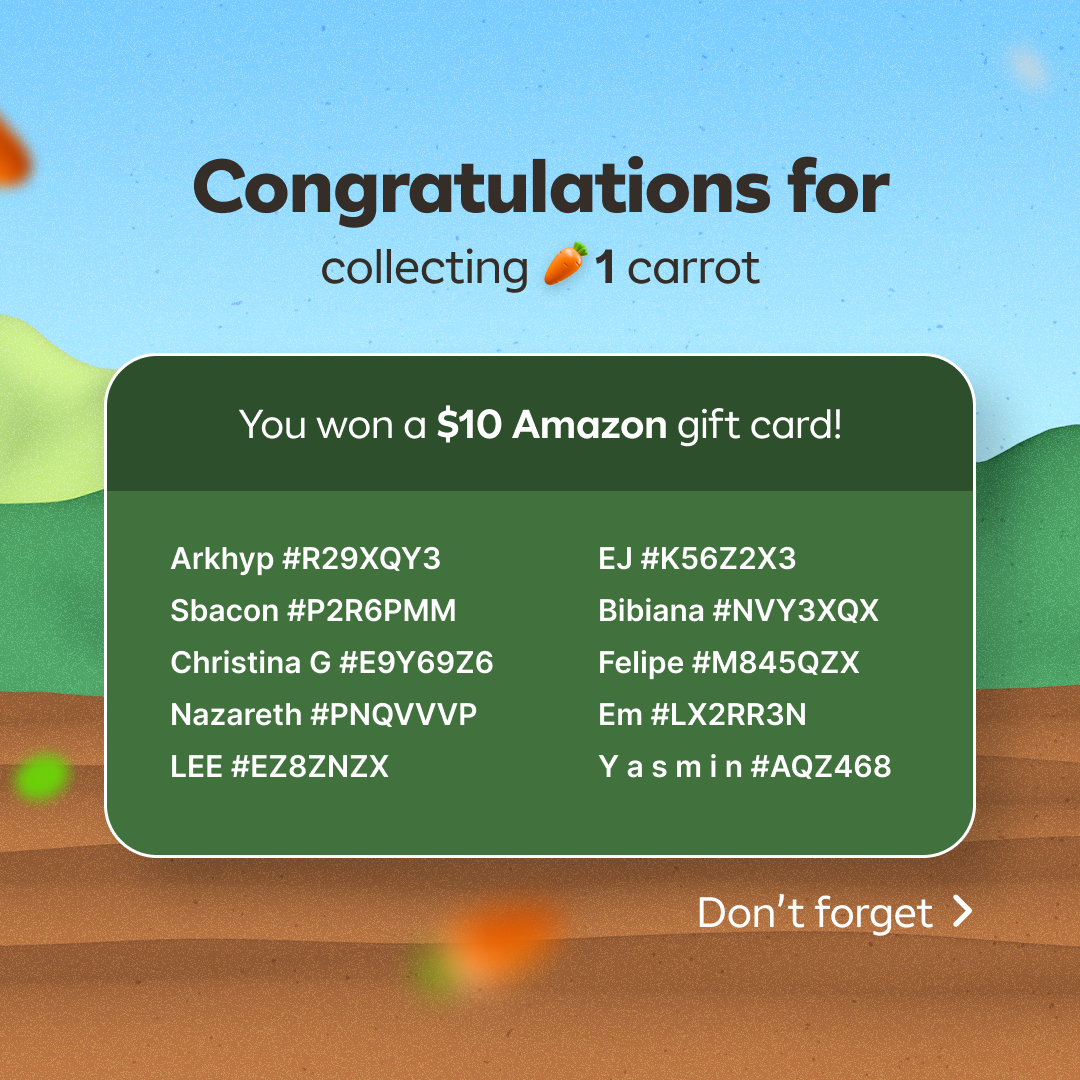 1000+Hey Karroters! Thanks for participating in our Collect the Carrots event 🥕💚 We appreciate everyone who participated this time, and were excited to see all your spring cleaning items! Drumroll, please… 🥁 Let’s find out who successfully collected the carrots and snagged a win! Please check the image above to see the list of winners 🏆 Amazon Gift Card Winners 1. Please check your "My Rewards" section in the app. Gift cards have all been sent out! 2. Some users may share the same name so please check the unique user number. To view your user number go to My Karrot > View profile. Our team has already reached out to all winners individually. 3. Share your excitement with the Karrot community in the comments down below! Don’t be discouraged if you didn't win this time, we run events at Karrot often! Remember that these events are about more than just the rewards. You’re making someone’s day and helping us build a more community-based marketplace. Thanks for tuning in and keep checking Karrot for more events like these 💗