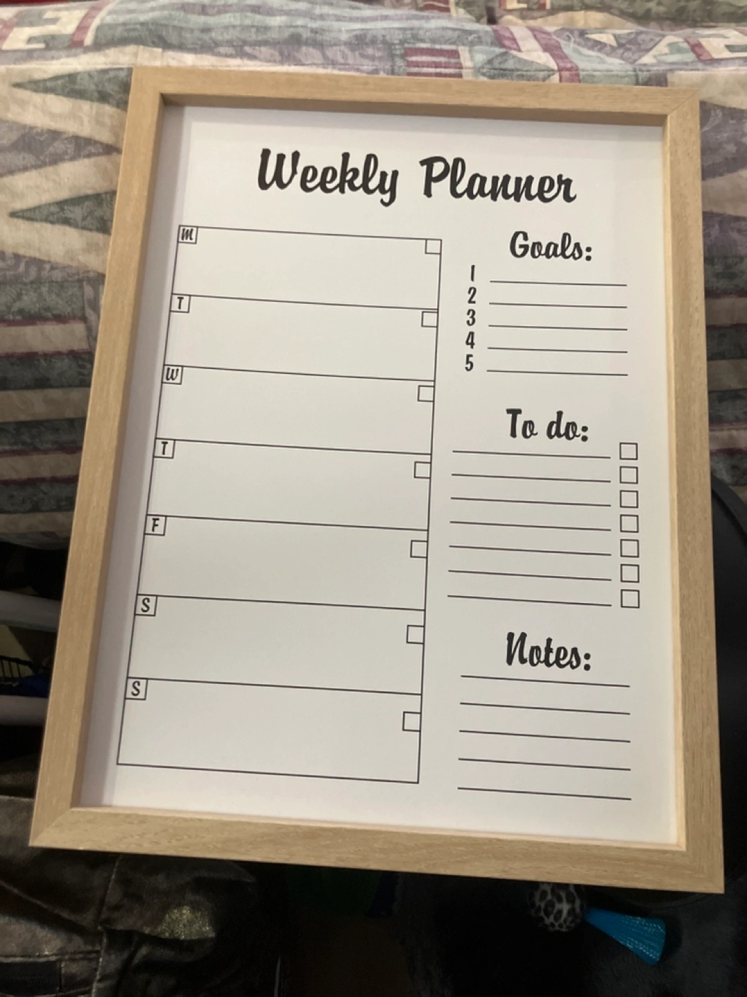 253Framed weekly planner. Features spaces for daily tasks, goals, to-do lists and notes. Dry erase surface.