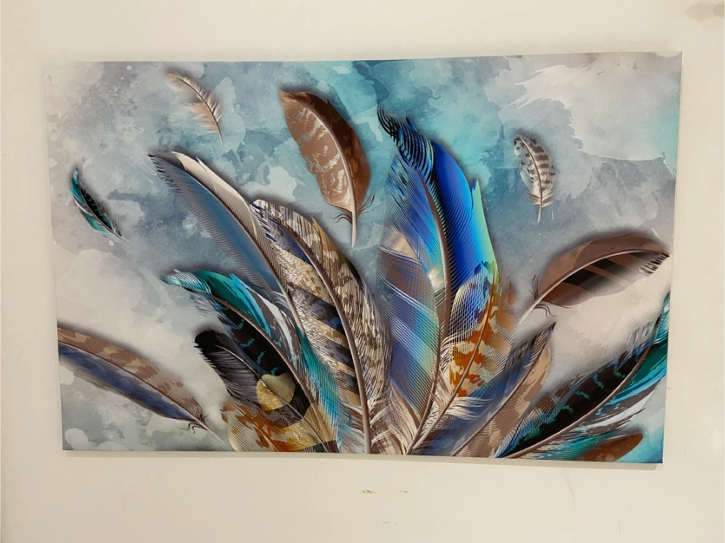 Canvas print featuring a collection of vibrant feathers in various colours and designs. It's a striking piece for home decor.