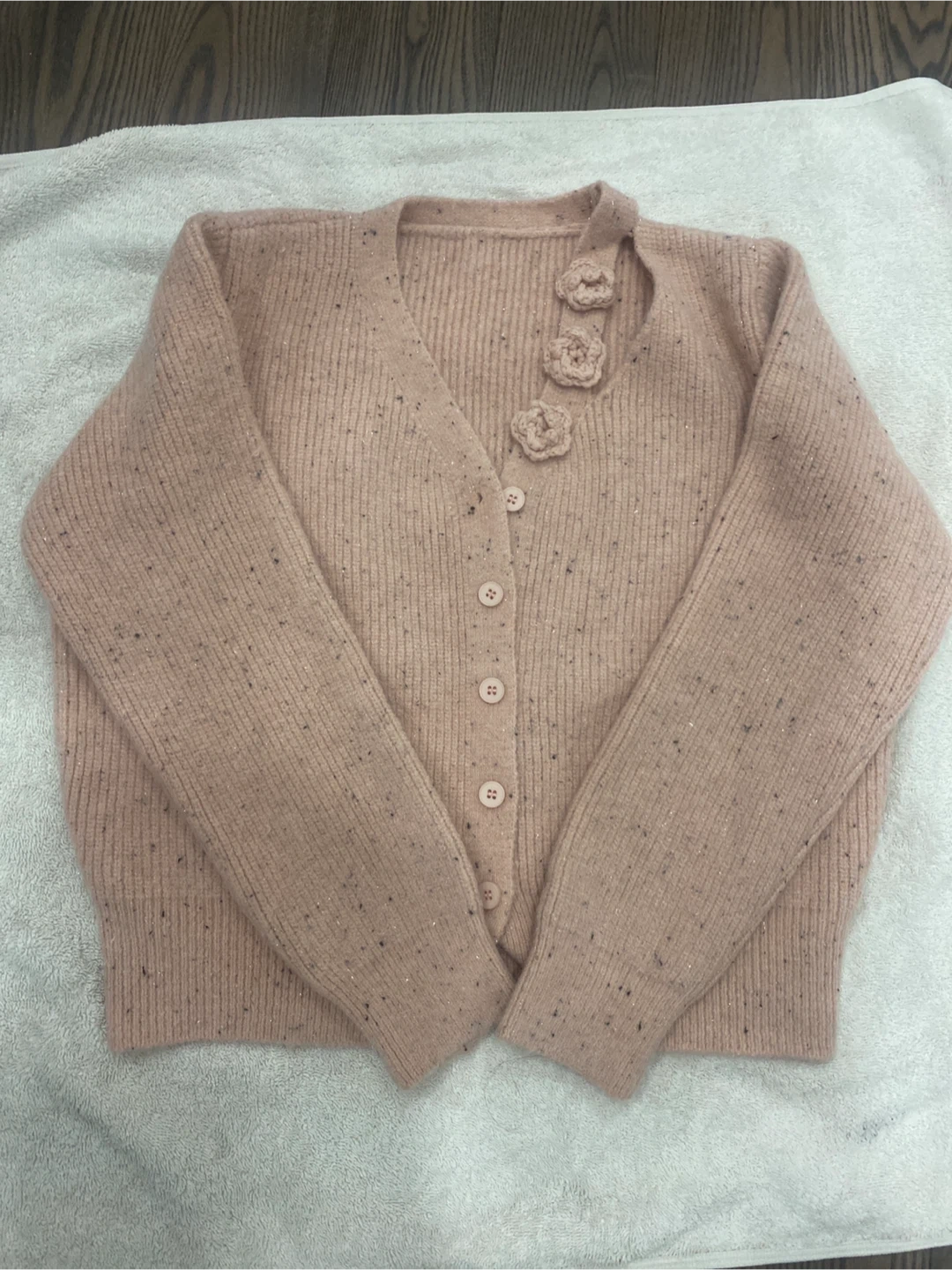 A lovely pink knit cardigan with cute flower details. It's in great condition and ready to add a touch of charm to your wardrobe! The material is soft and cozy, perfect for layering on cooler days