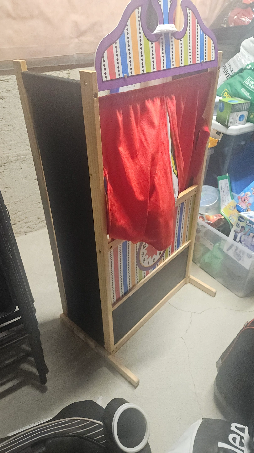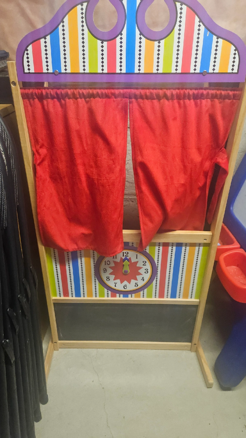 Selling a cute puppet theatre for kids. It has a chalkboard at the bottom for extra fun and will include 10 plush puppets! The theatre includes red curtains and a colourful design with a clock.