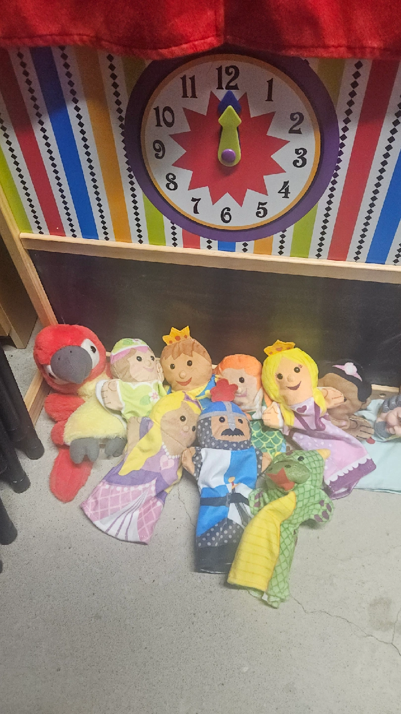 Selling a cute puppet theatre for kids. It has a chalkboard at the bottom for extra fun and will include 10 plush puppets! The theatre includes red curtains and a colourful design with a clock.