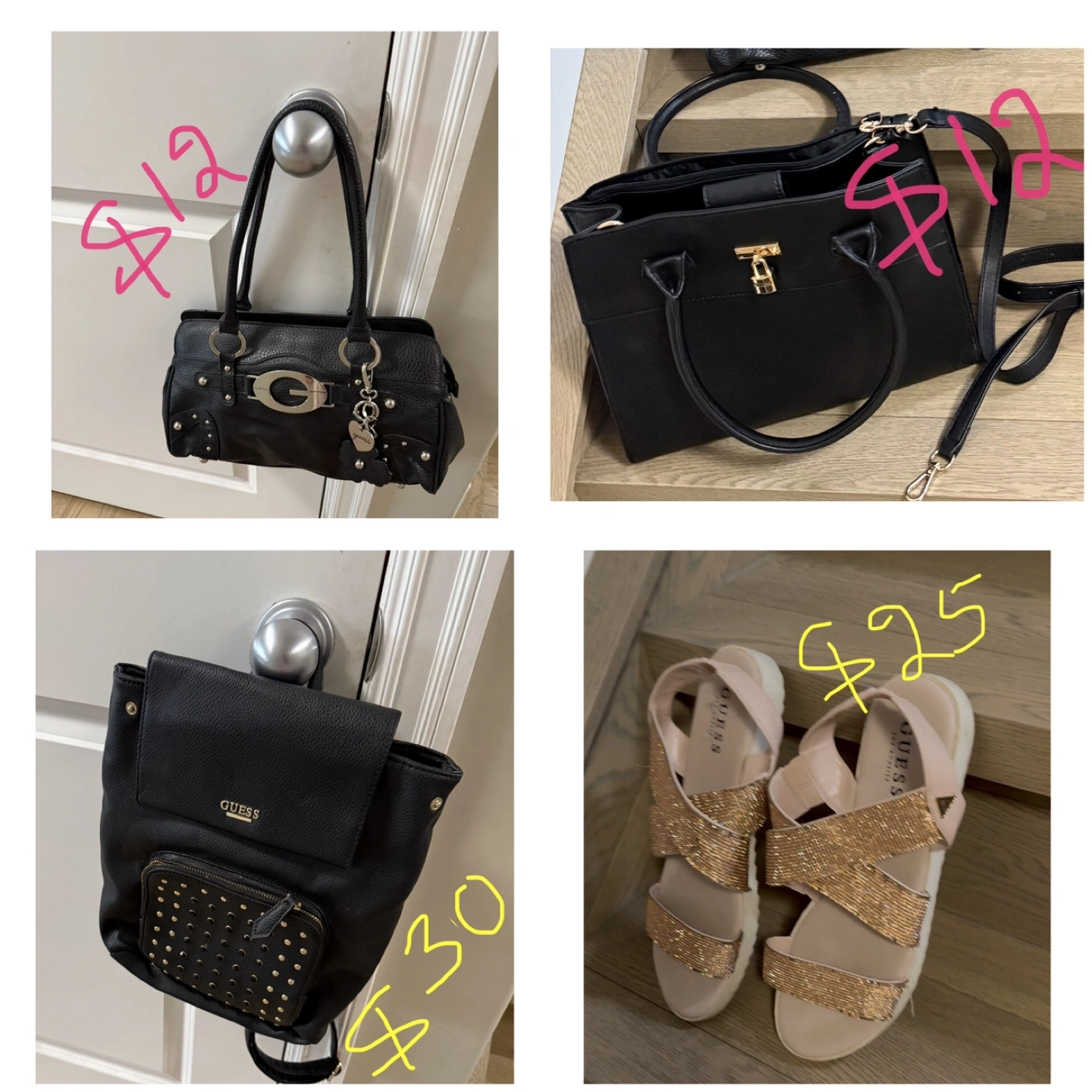 Price on Each item .Selling a variety of Guess items! There's a black handbag, a black backpack, and a pair of sandals. All are in great condition and ready for a new home!