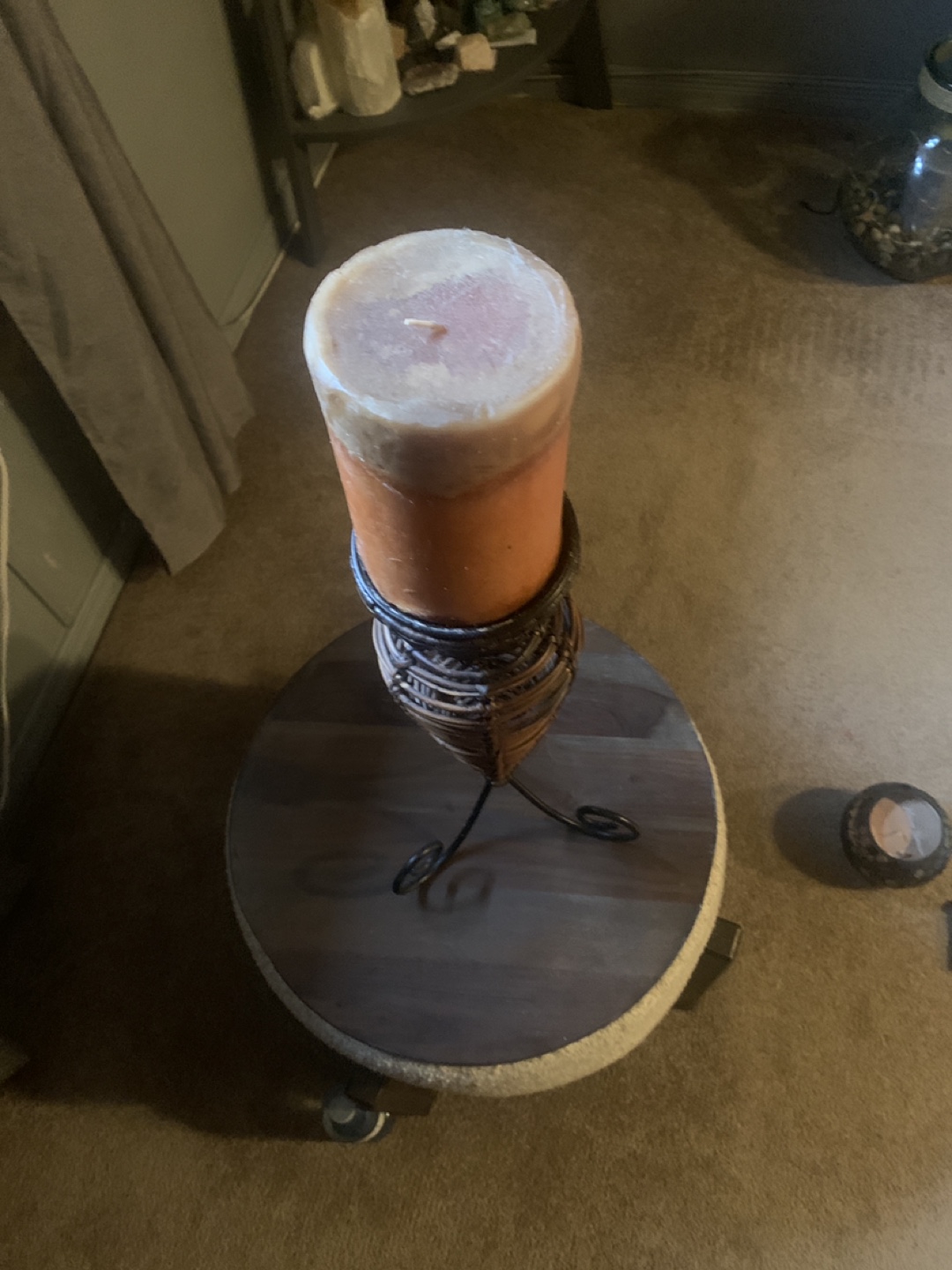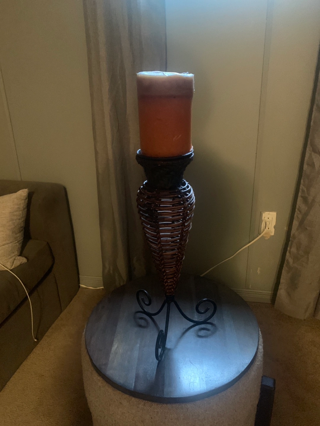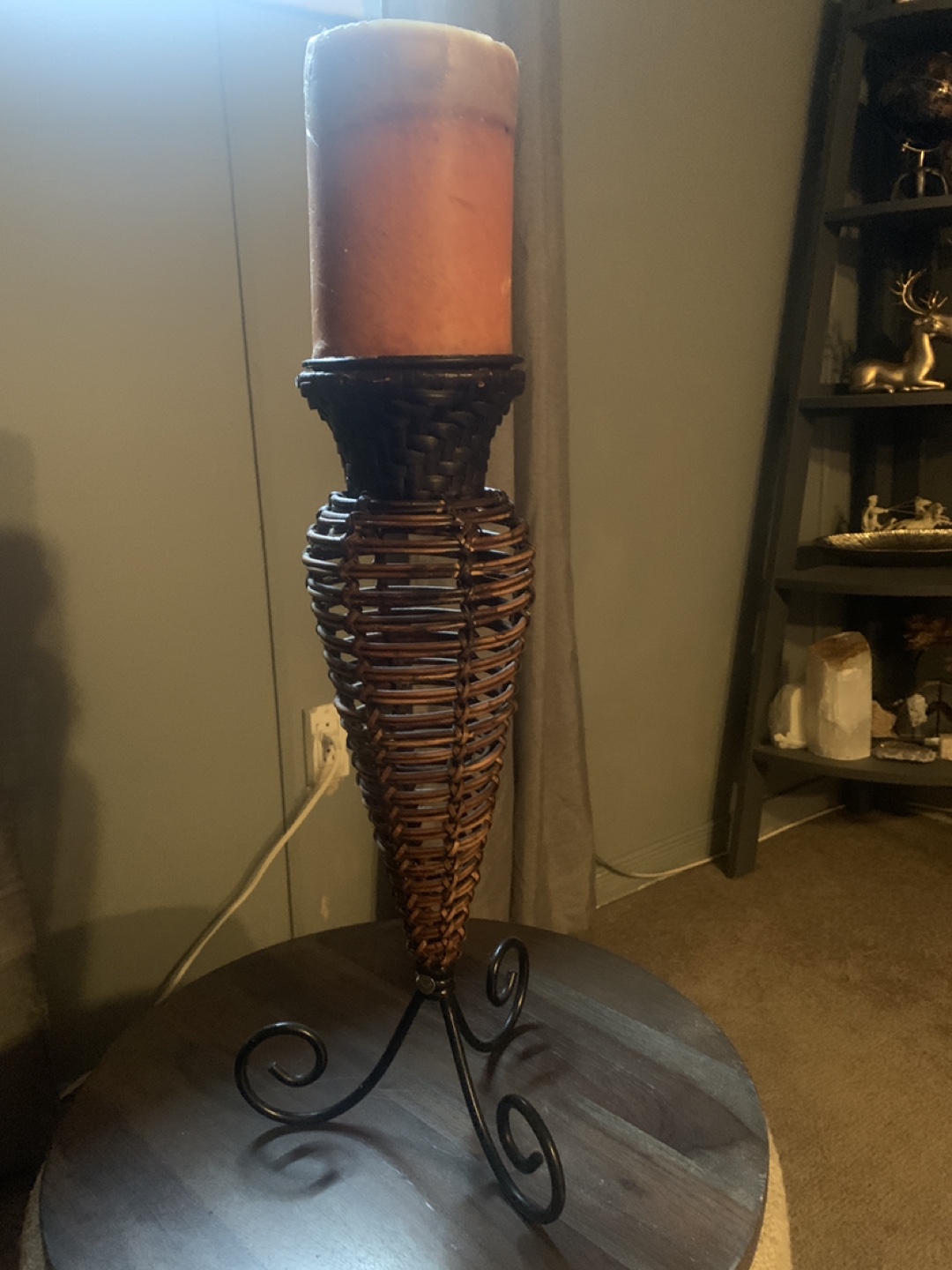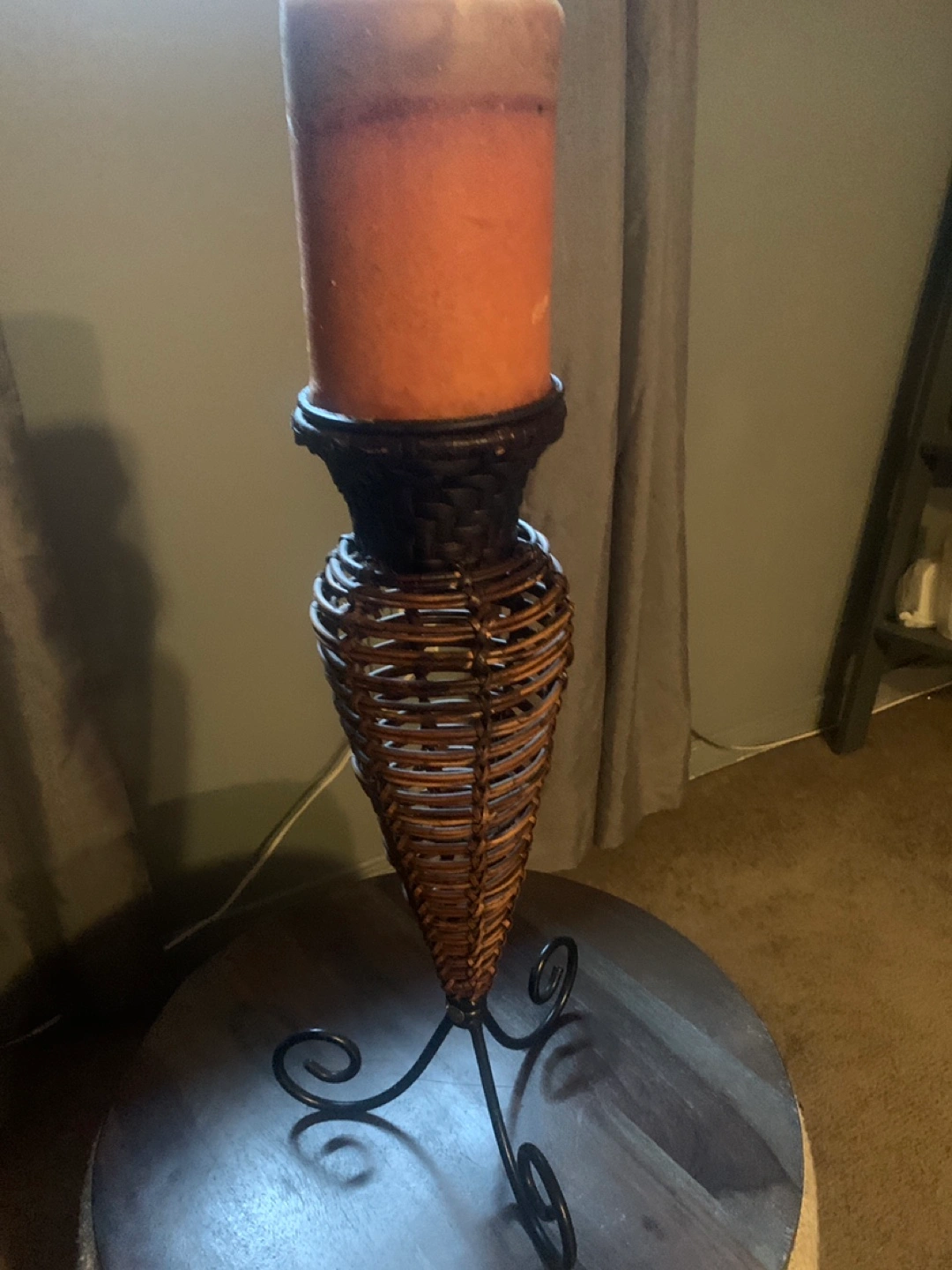 Tall candle holder. Features a wicker design and metal base. Perfect for adding ambiance to your home. Includes a pillar candle.