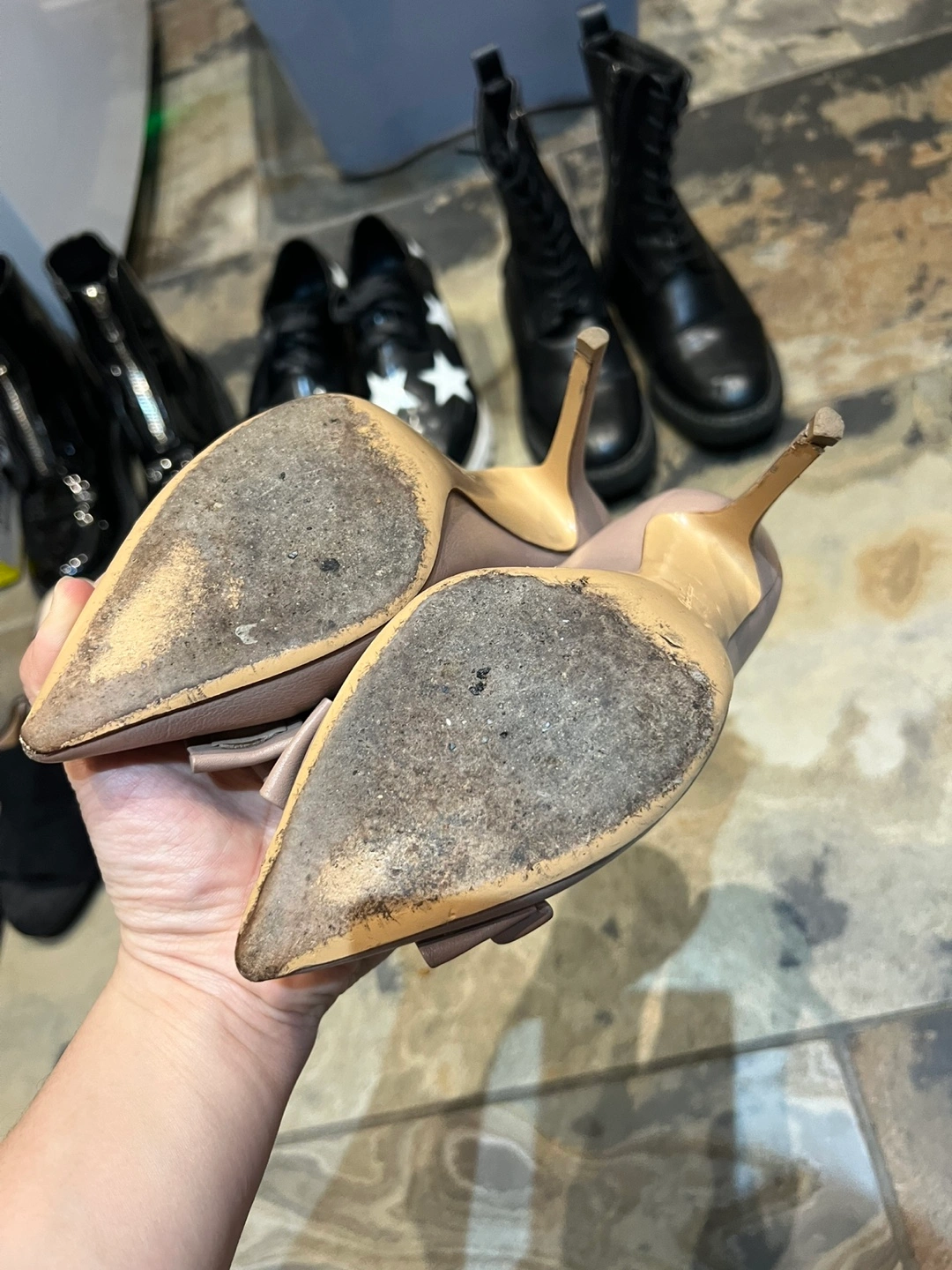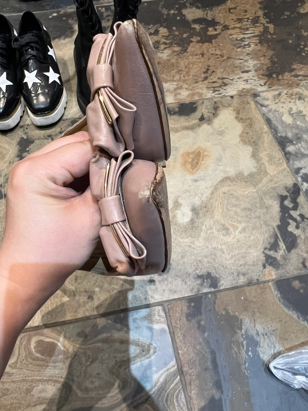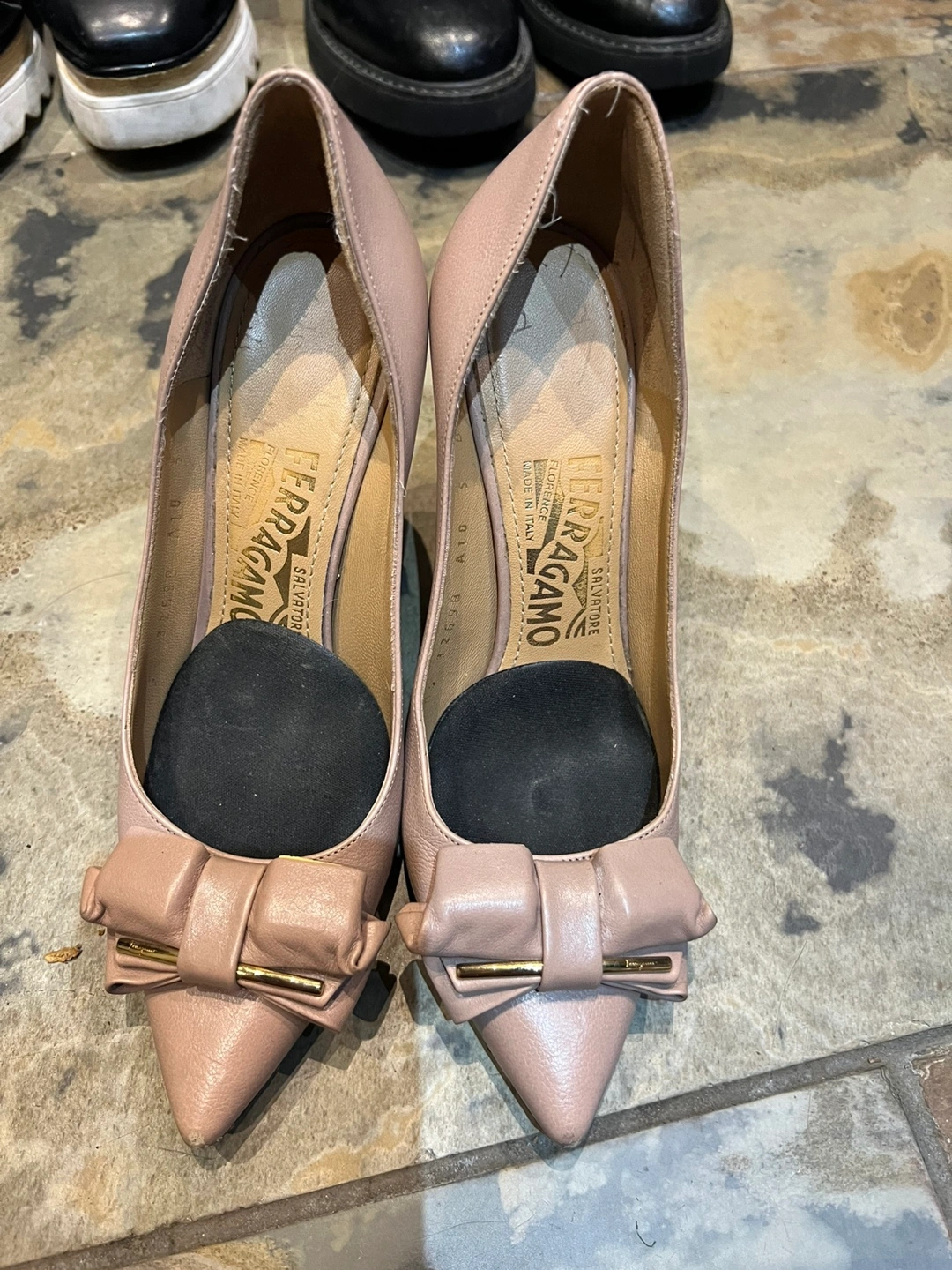 553Pre-owned Salvatore Ferragamo heels. Blush pink leather. Pointed toe. Bow detail. Size 5 1/2. Made in Italy. Shows wear. Not fake. Bought at Yorkdale Salvatore Ferragamo store
