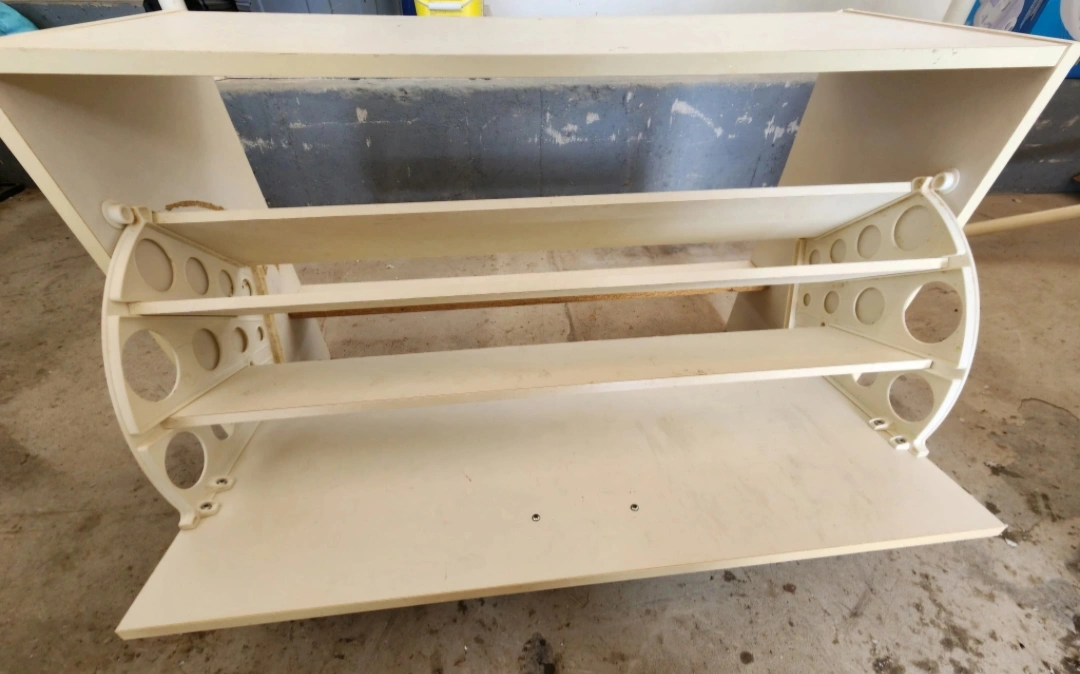 Off-white shoe storage cabinet. Features a pull-out drawer and a lift-up door revealing three shelves. Great for organizing shoes. Shows some wear.