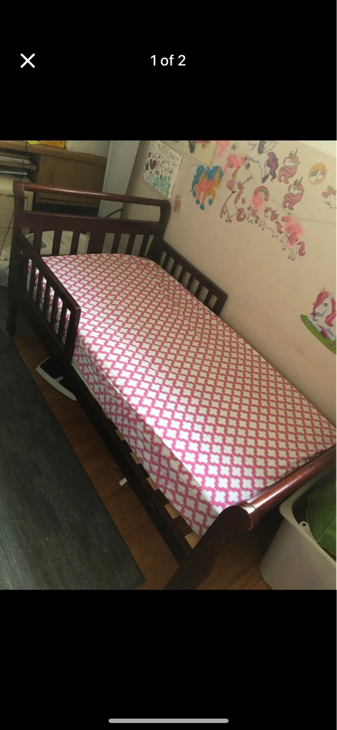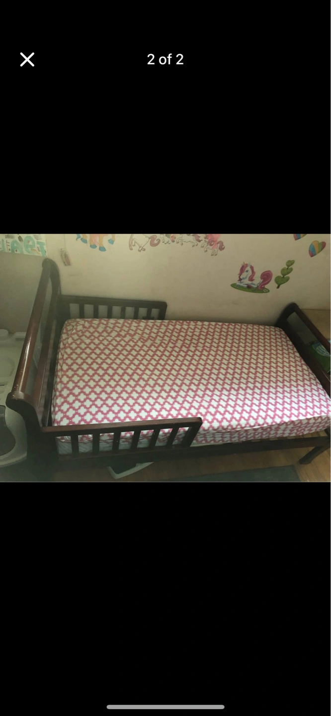 83Dark brown wooden toddler bed. Includes guard rail. Good used condition. Some minor wear.