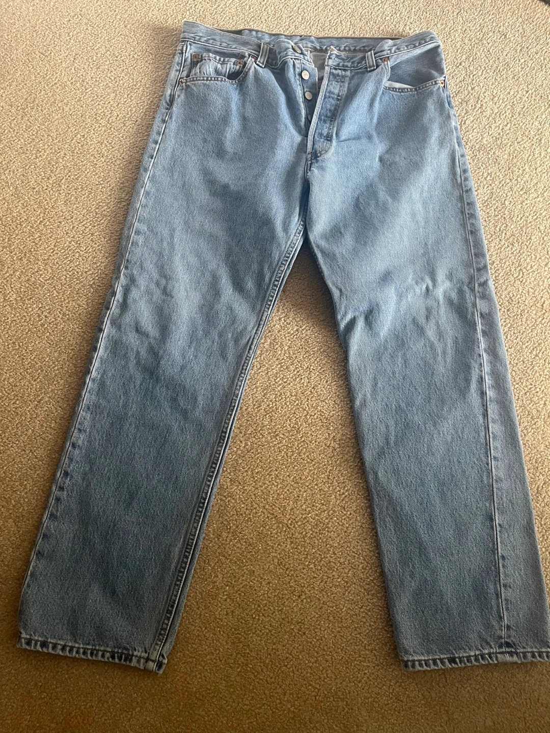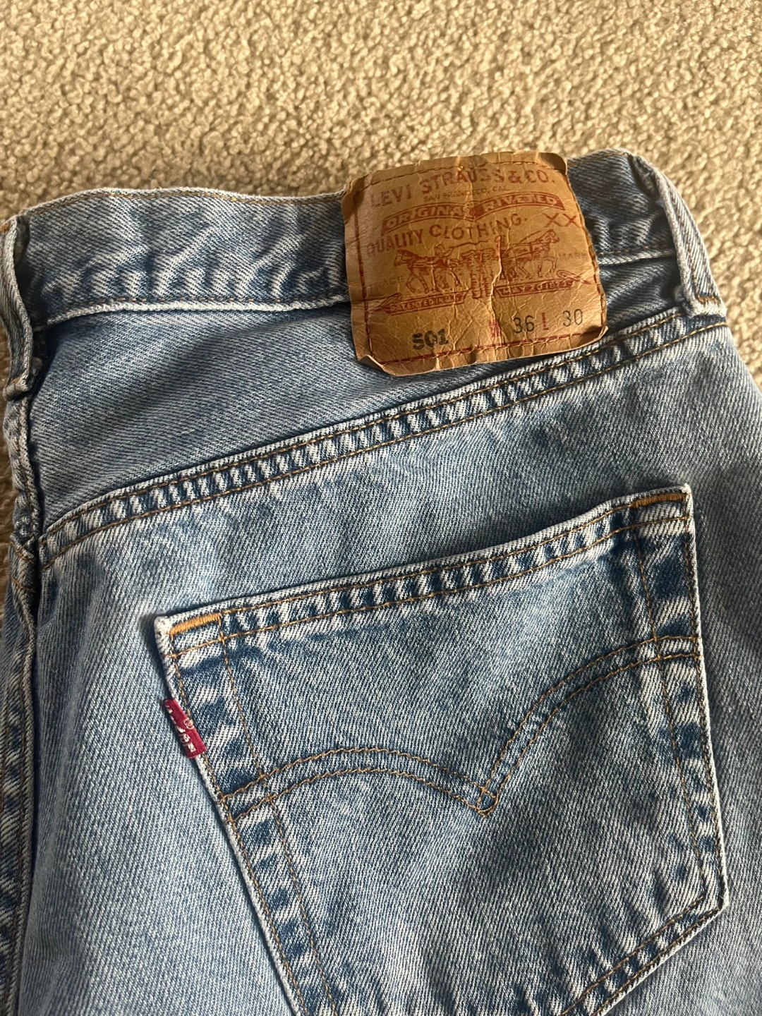 165Men's Levi's 501 jeans. Light wash denim. Classic straight leg fit. Size 36x30. Button fly.