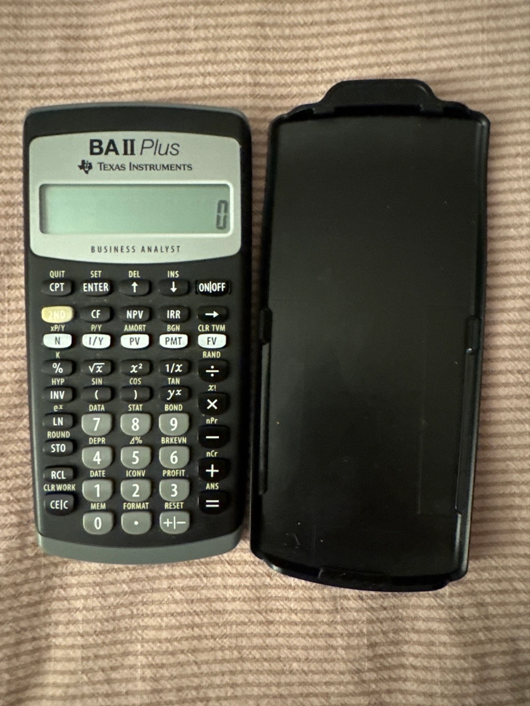 Financial calculator, includes hard case. Features include TVM, amortization, and statistical functions. Good for students and professionals.