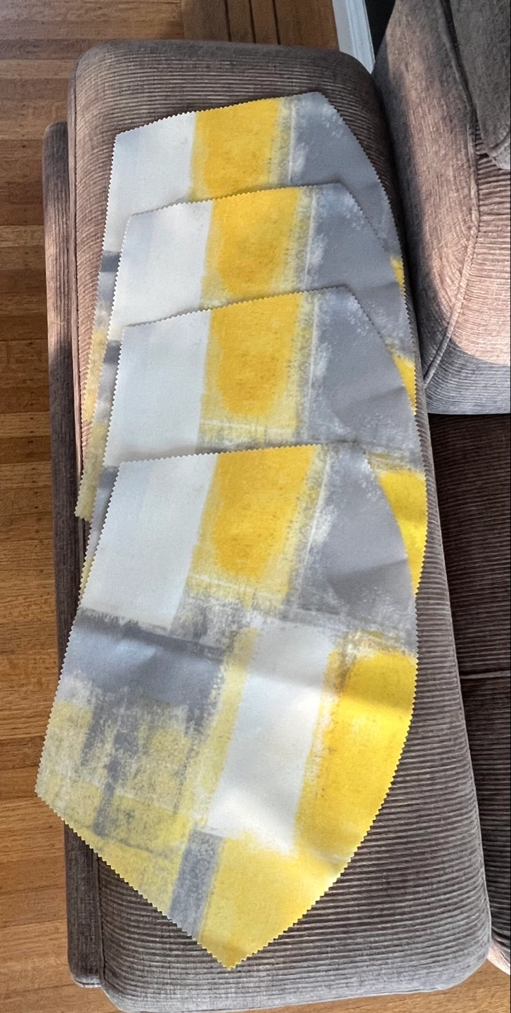 4 rectangular dinner placemat/1 round placemat. Grey/yellow/white abstract