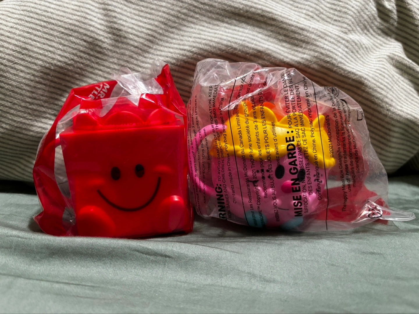 Two toys from McDonald's Happy Meals. One is a small racing Minion in a box, the other is a red Mr. Men toy. Also included is a yellow Minion tin.