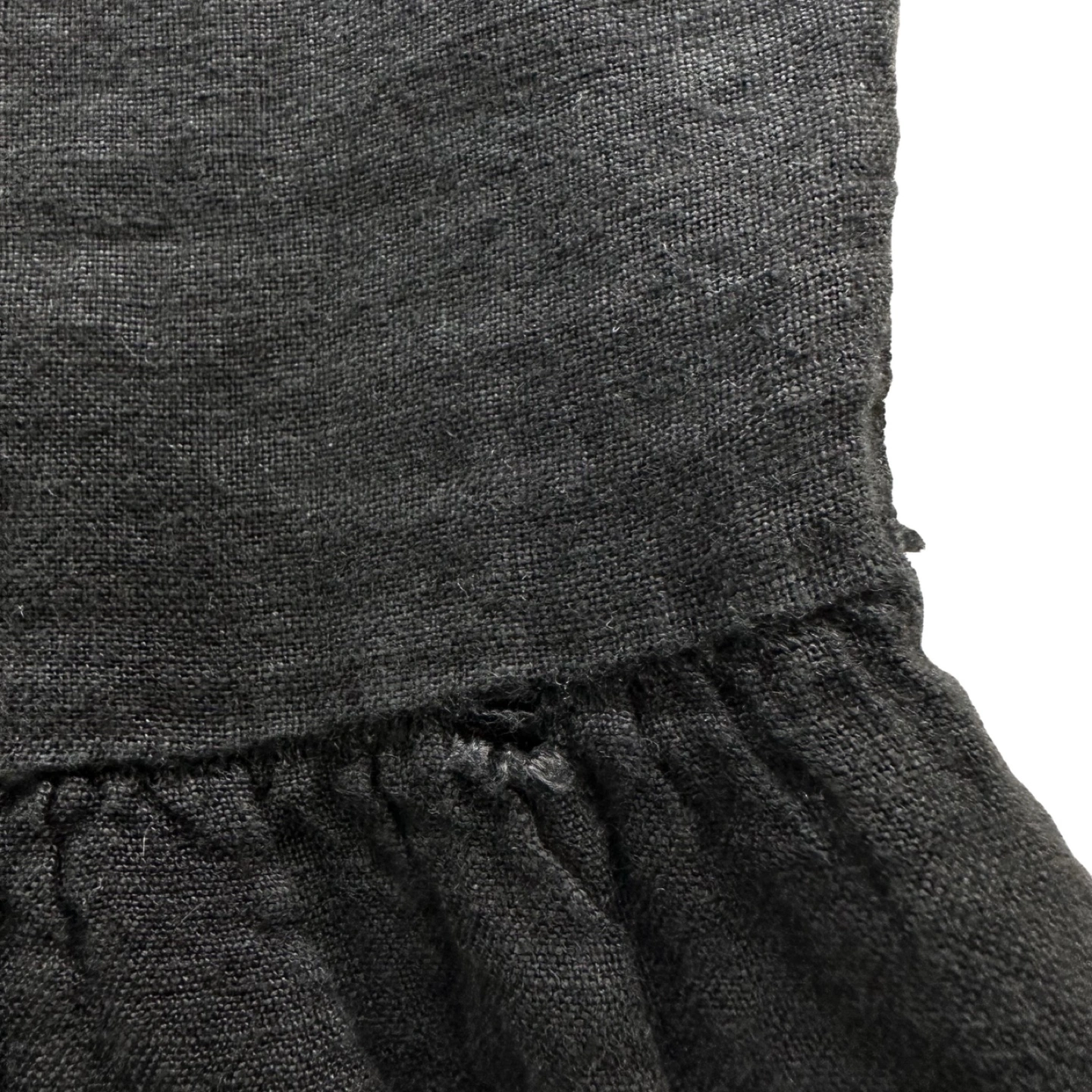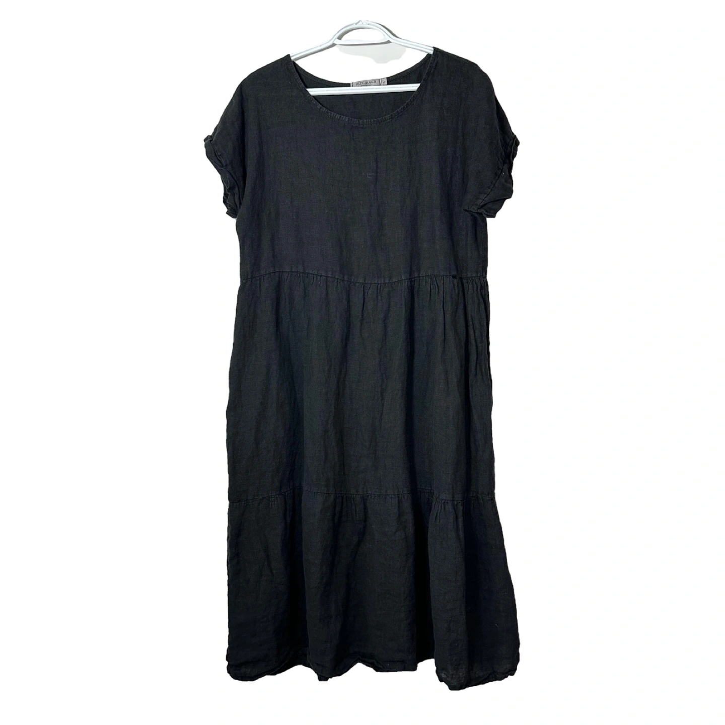 Black linen midi dress. Tiered design. Short sleeves. Relaxed fit. Made in Italy.