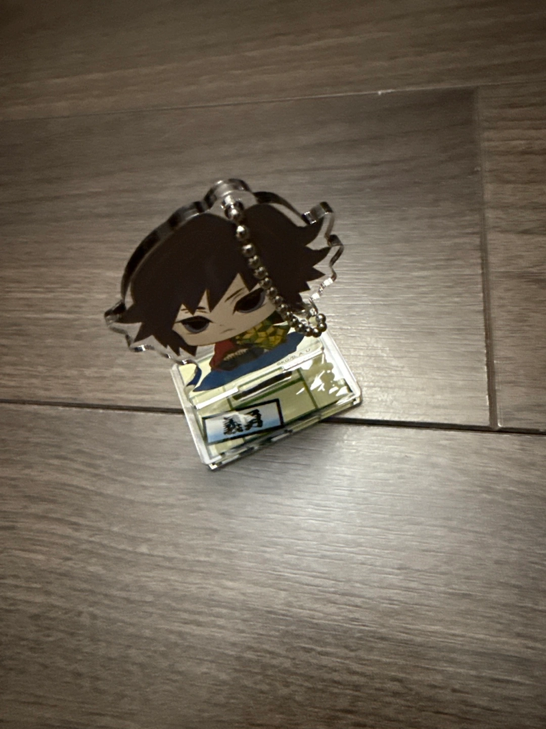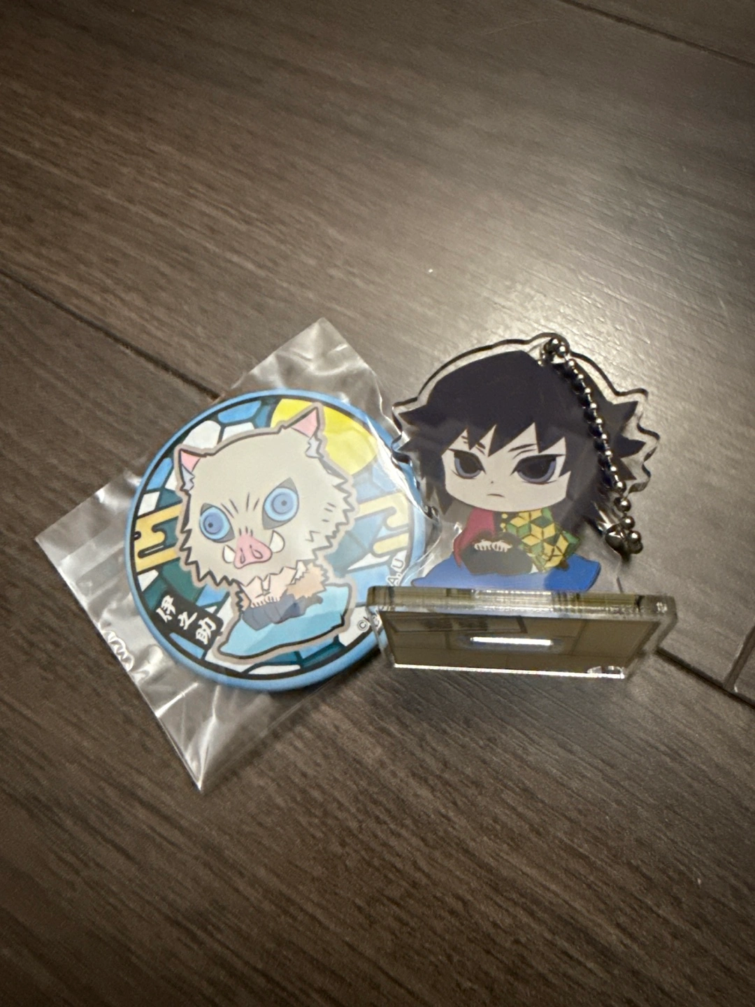 26Adorable Demon Slayer acrylic keychain featuring giyu and button featuring Inosuke Hashibira. Collectible anime merchandise. Perfect for fans.