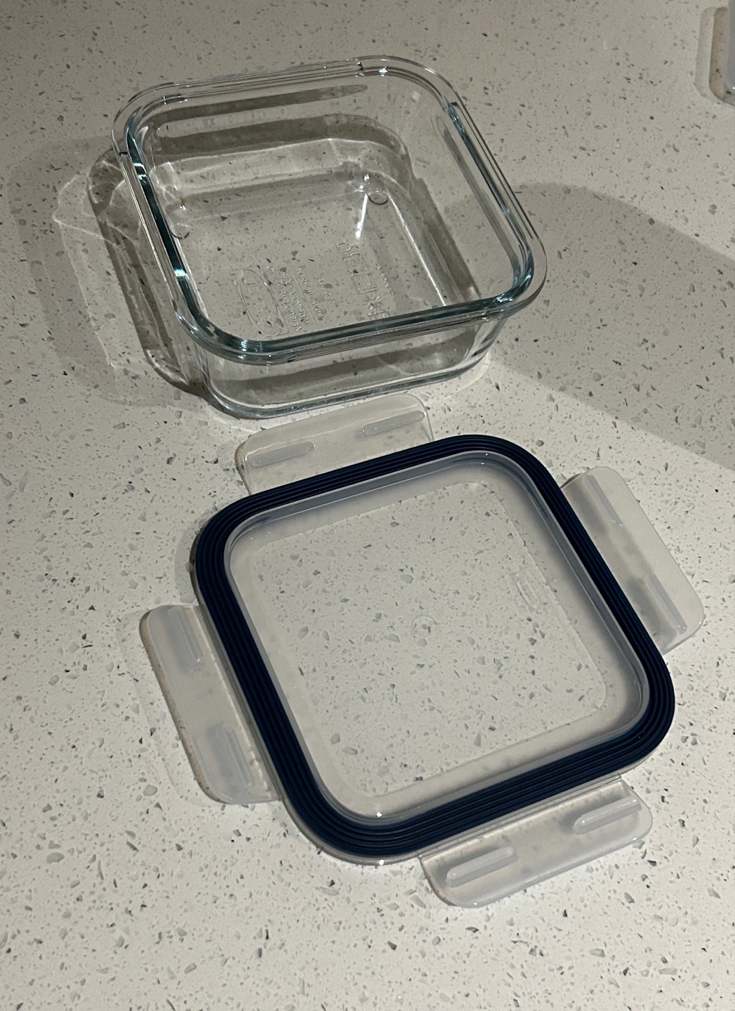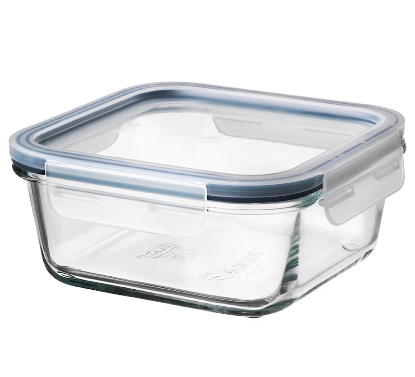 Square glass food storage containers. Clear glass with a grey lid. Microwave and oven safe. Perfect for leftovers or meal prep.