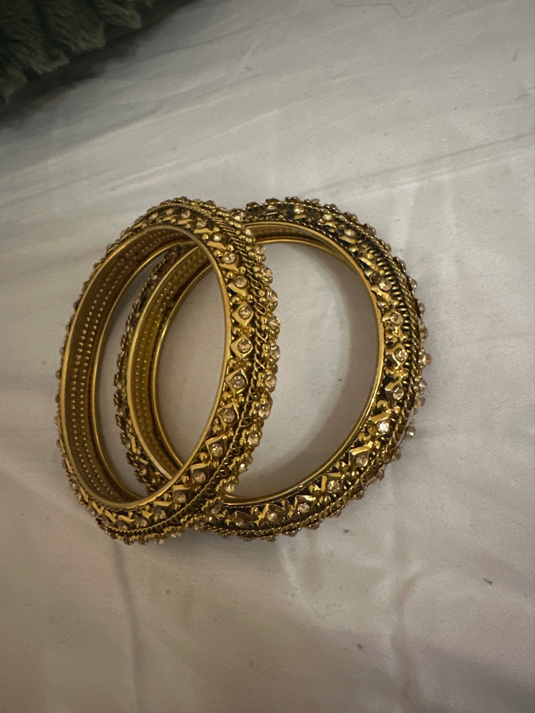 Beautiful gold bangles. Intricate detailing. Rhinestone accents. Perfect for adding a touch of elegance to any outfit.