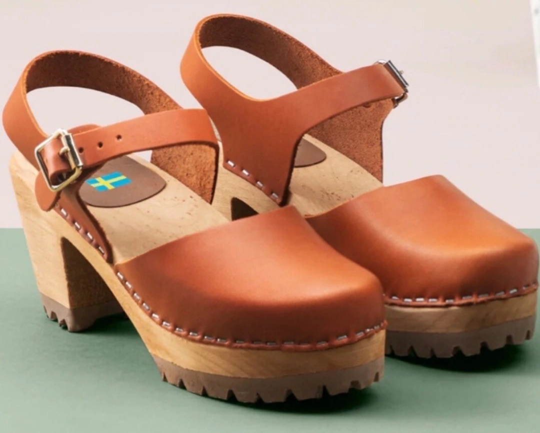 Genuine leather clogs. Tan coloured leather upper. Wooden sole and heel. Ankle strap with buckle closure. Size 38.