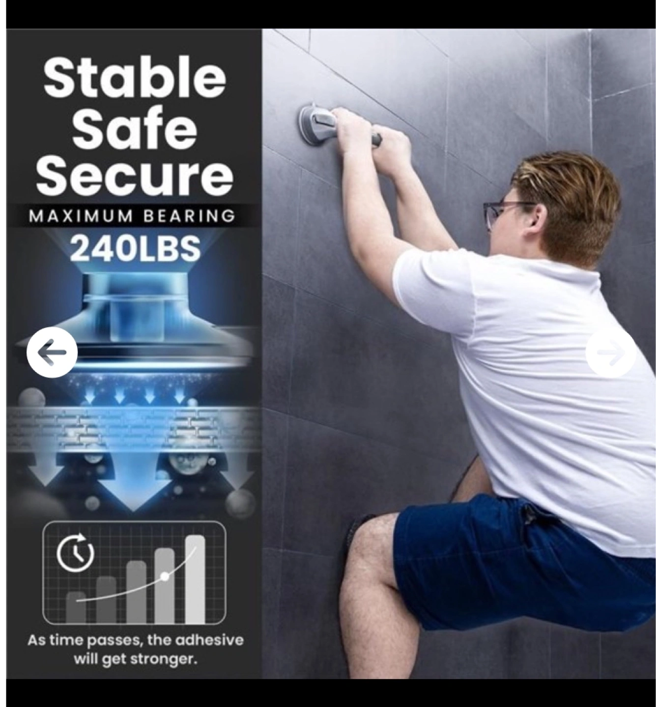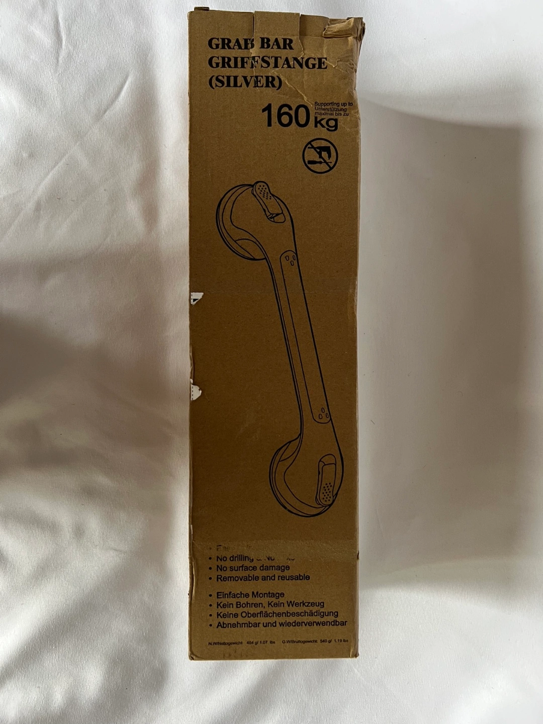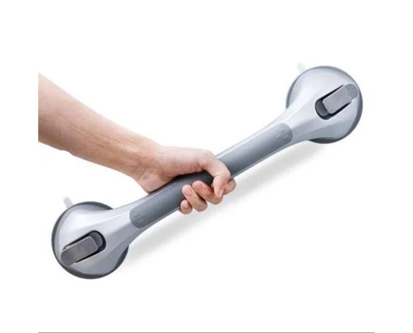 Silver grab bar. Strong suction cups. Easy installation. No drilling needed. Removable and reusable. Supports up to 240 lbs.