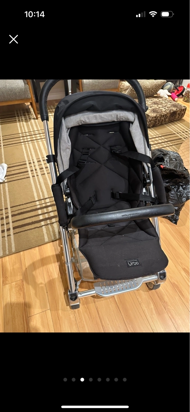 Lightweight stroller, silver frame, black seat fabric. Includes the seat and chassis. Good used condition. Some minor wear.