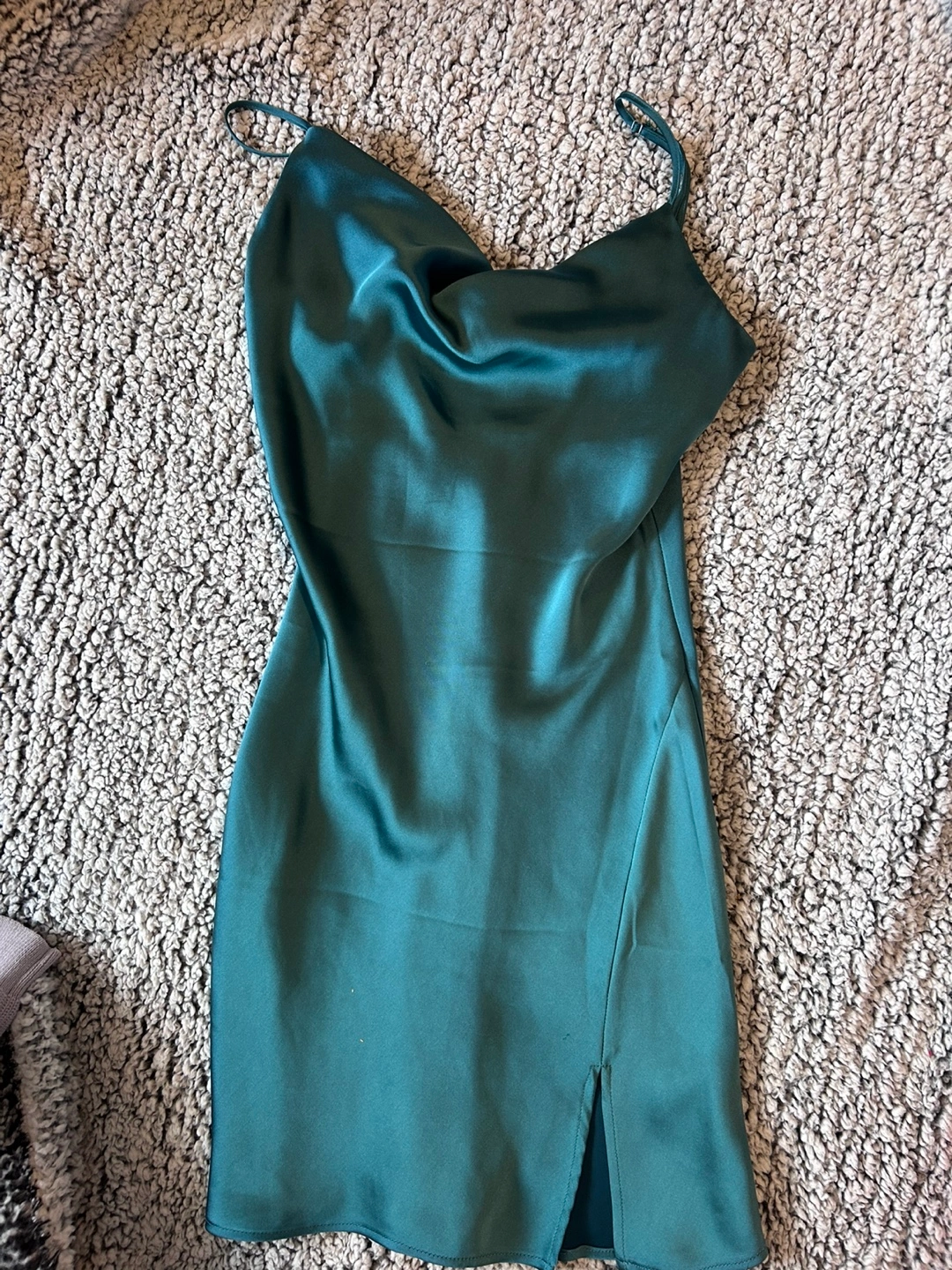 Beautiful dark green satin slip dress. Features a cowl neckline and a thigh-high slit. Perfect for a night out!!
