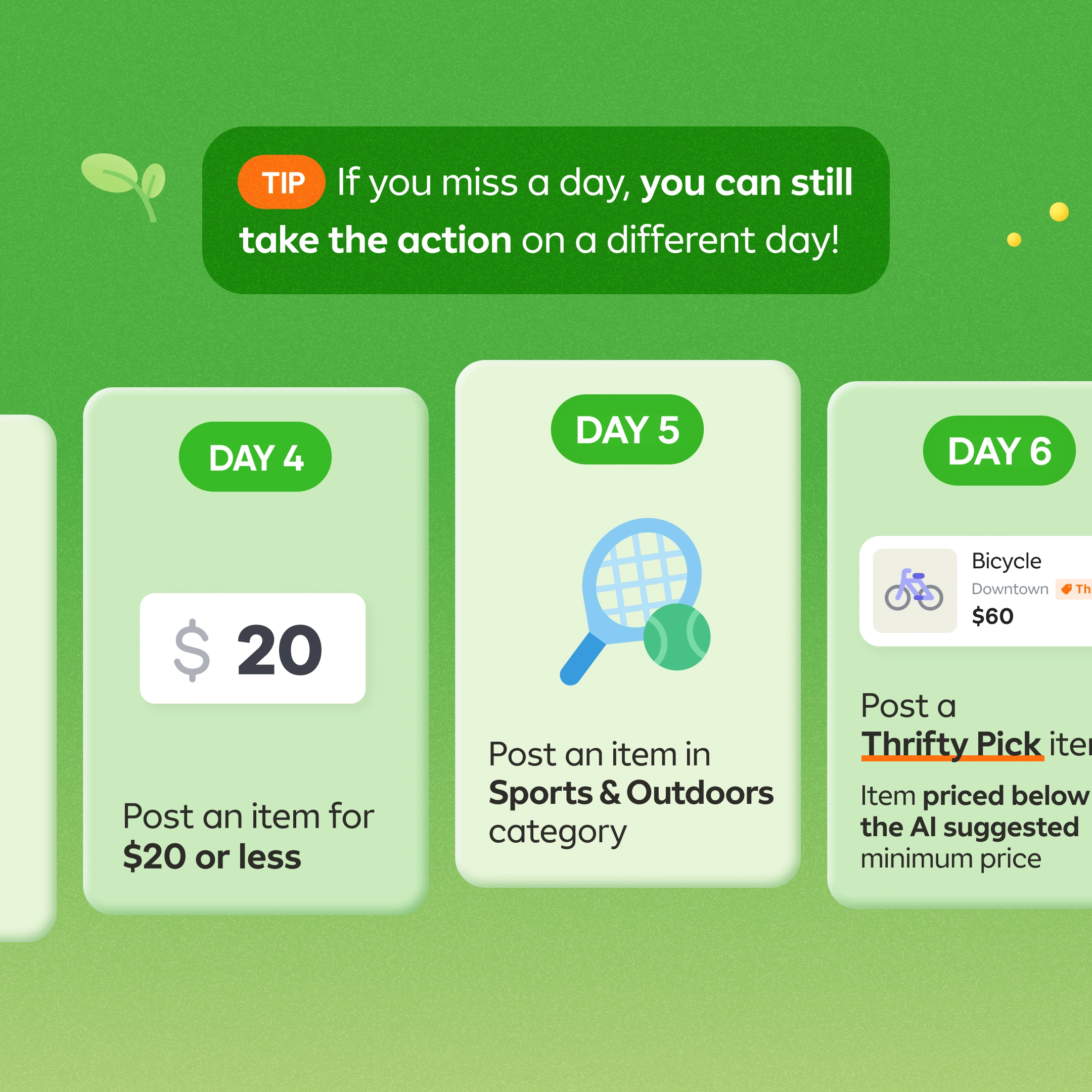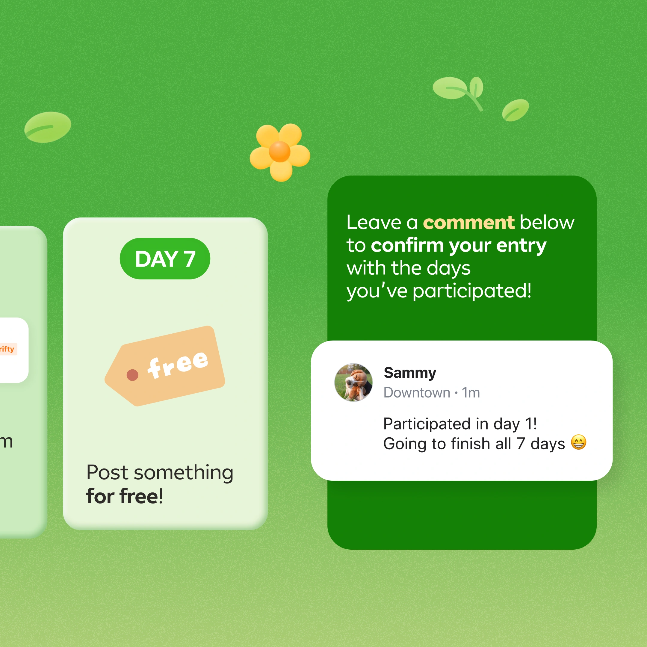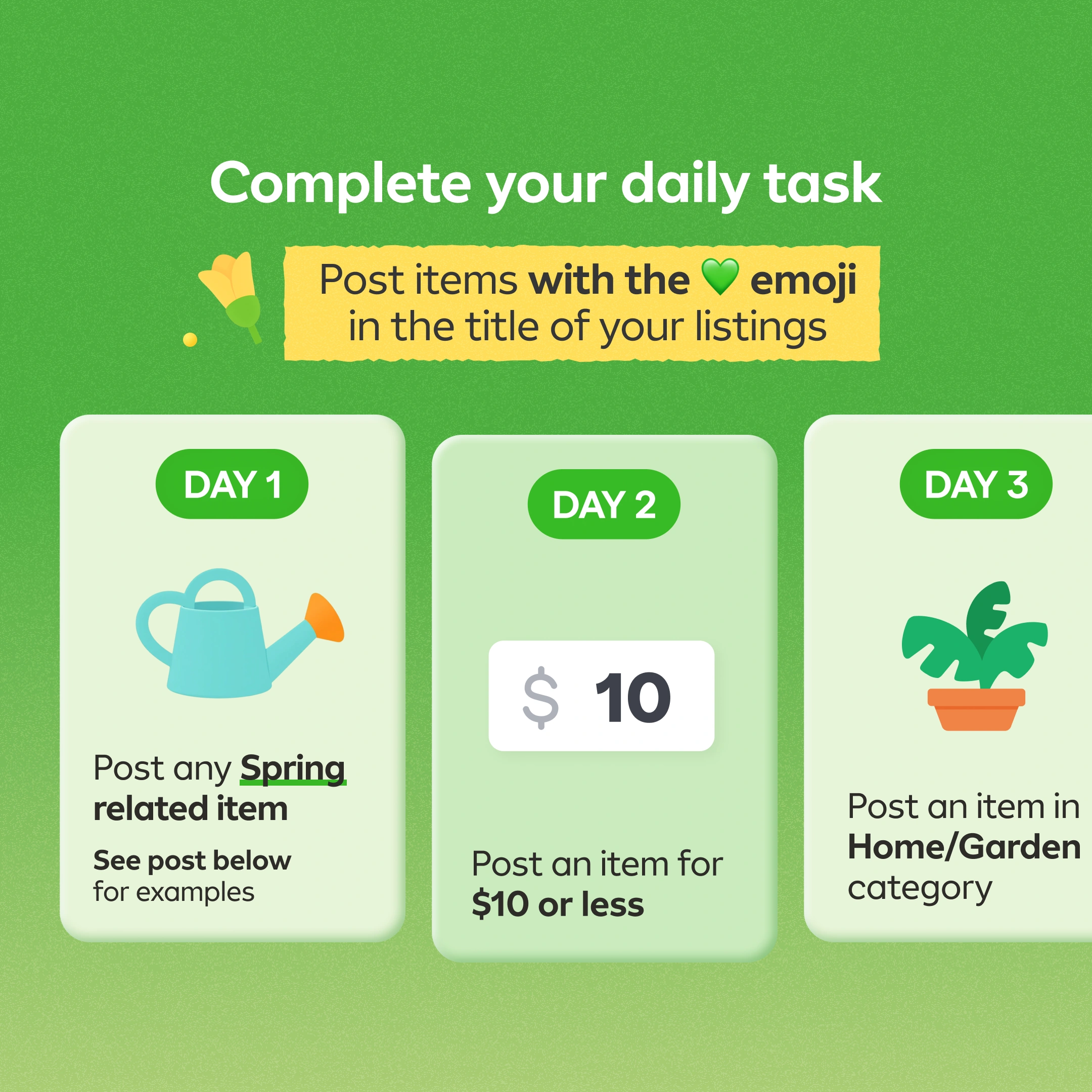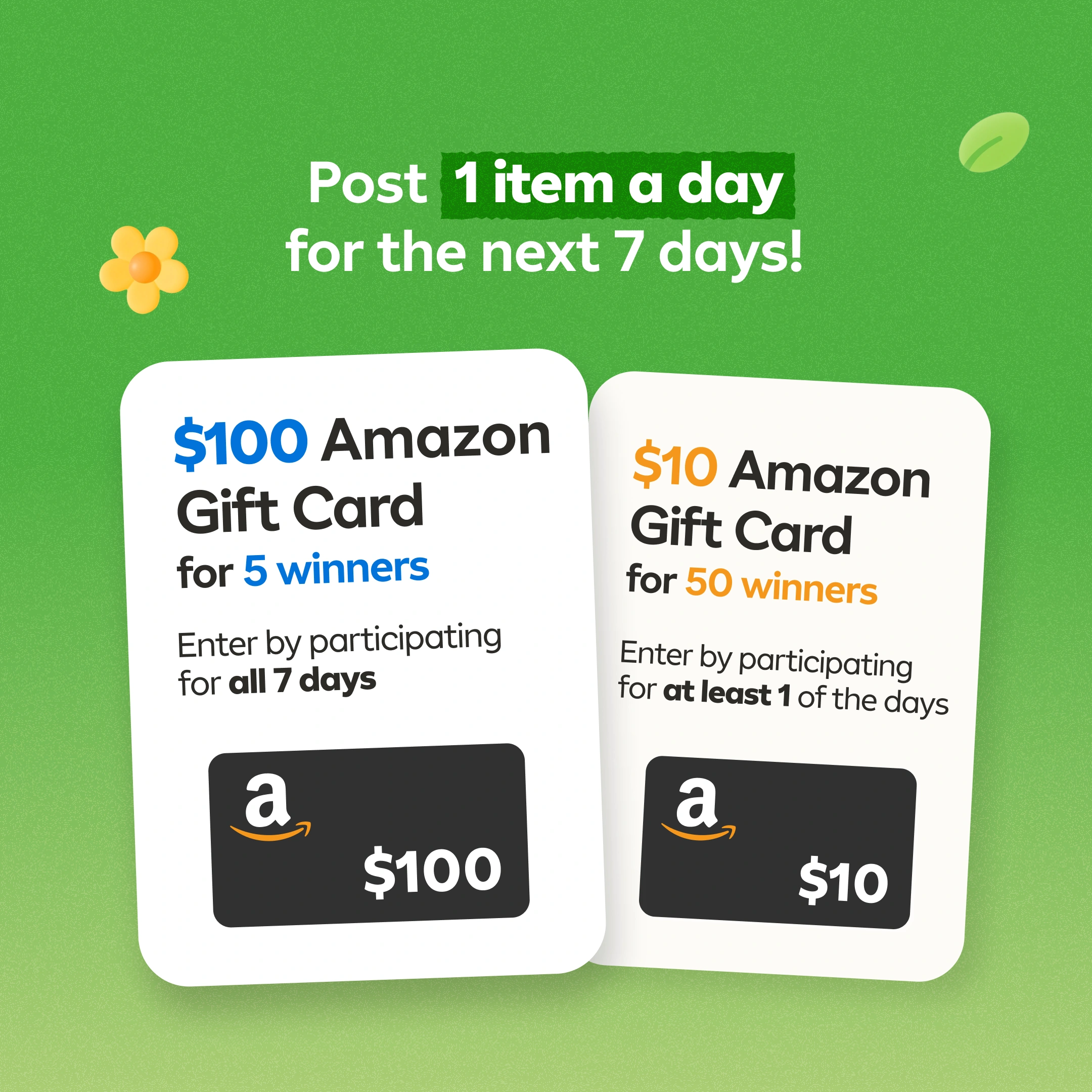1000+Hey Karroters, Join us for our Spring Declutter Challenge! This week, we’re making your spring decluttering simple and stress-free. Complete 1 post a day for 7 days for a chance to win big! When: April 11 - 17 PRIZES: 💸 $100 Amazon Gift Card for 5 winners - Enter by participating for all 7 days 💸 $10 Amazon Gift Card for 50 winners - Enter by participating for at least 1 of the days 🥕🥕🥕 TIP: If you miss a day you can still post on a different day! For example, if you choose to complete all 7 days on the last day you will still be counted for the draw! 🥕🥕🥕 HOW IT WORKS: **Post items with the 💚 emoji in the title of your listings ** Day 1 - Post any Spring related item (eg. plants, spring clothing, outdoor furniture, gardening tools, floral items, yard/backyard items, sporting equipment, hiking/camping gear etc.) Day 2 - Post an item for $10 or less Day 3 - Post an item in Home/Garden category Day 4 - Post an item for $20 or less Day 5 - Post an item in Sports & Outdoors cateogry Day 6 - Post a "Thrifty Pick" item (priced below the AI suggested minimum price) Day 7 - Post something for free! 💬 You must comment below with the days you’ve participated to confirm your entry! *Don’t forget! We’re also donating $1 for every post made towards planting trees for Earth Month* See post here: https://ca.karrotmarket.com/buy-sell/4761086 🌳 Winners will be announced on April 18. Terms & Conditions - Listings must include pictures of actual items and an accurate description. - Listings must follow Karrot’s guidelines and policies. - Items listed in Karrot’s Prohibited Items will be excluded. - Promotion is only available to users in Canada.