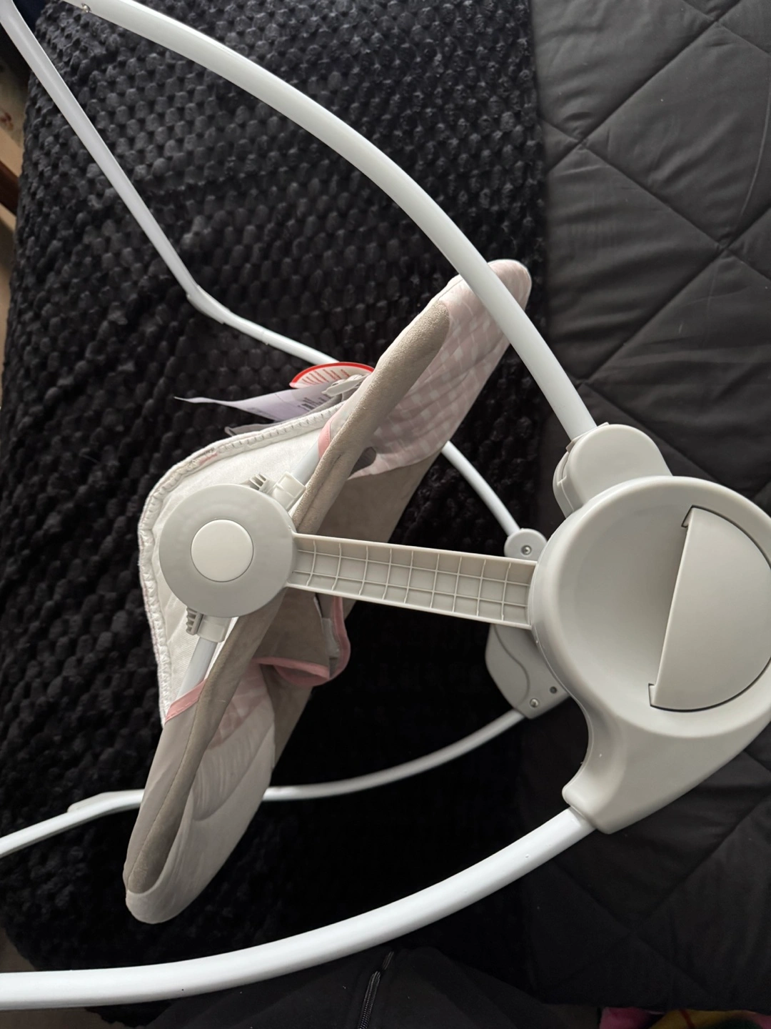 Infant swing, pink and grey colour scheme. Flora the unicorn. Features multiple speeds and sounds. Good condition, minor wear. Missing the removable toy bar. Takes batteries.