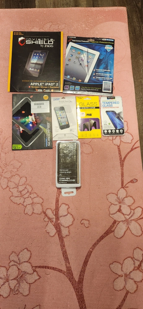 Assorted screen protectors for iPad 2, Samsung Galaxy Tab 7.7, iPhone, and other devices. Includes ZAGG InvisibleShield and other brands. New, unopened packages. I'm asking 10 dollars each or 50 dollars for the bundle.