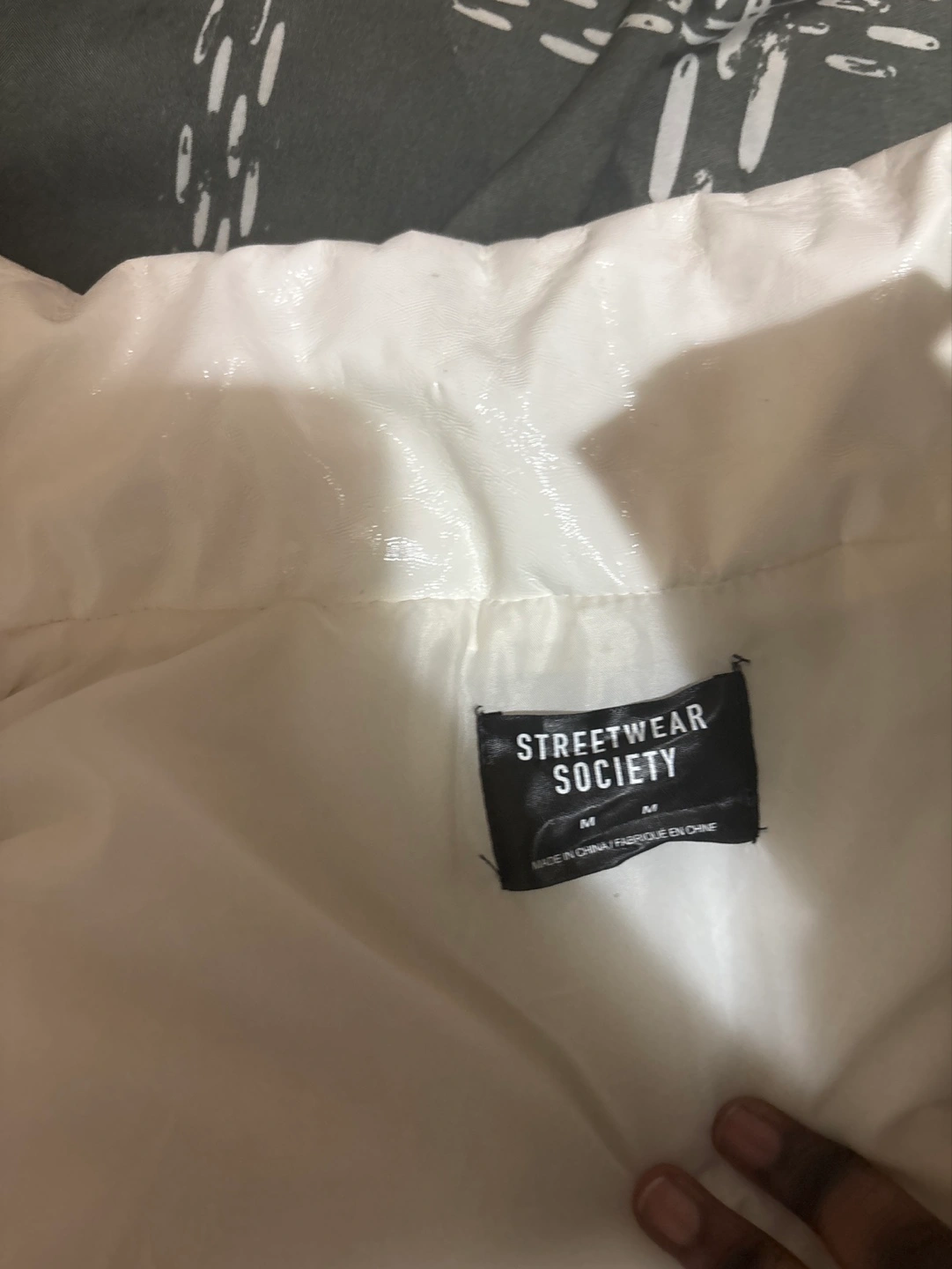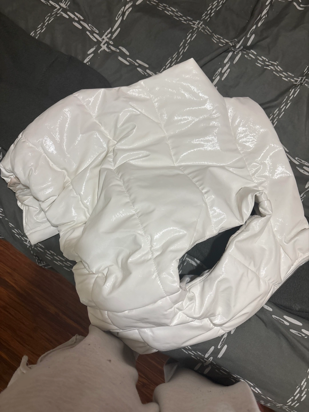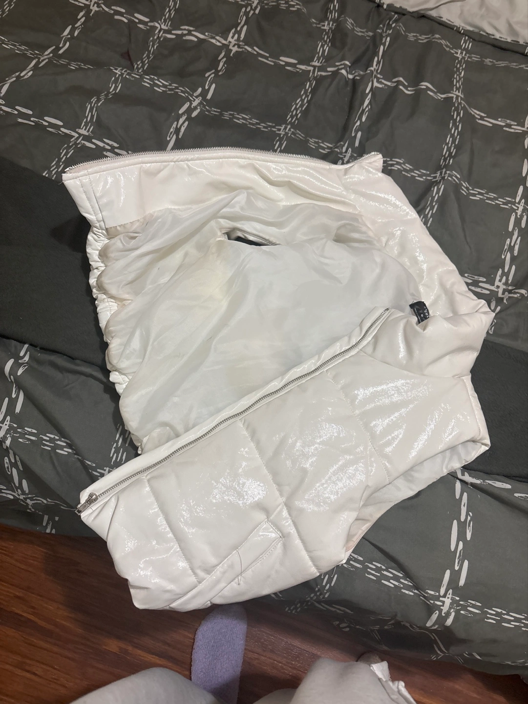 White puffer jacket. Size medium. Shiny material. Zipper closure. Pre-owned.