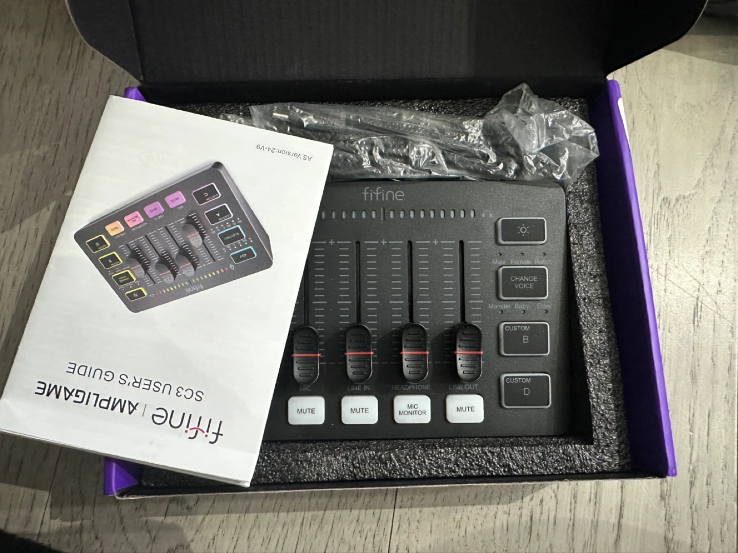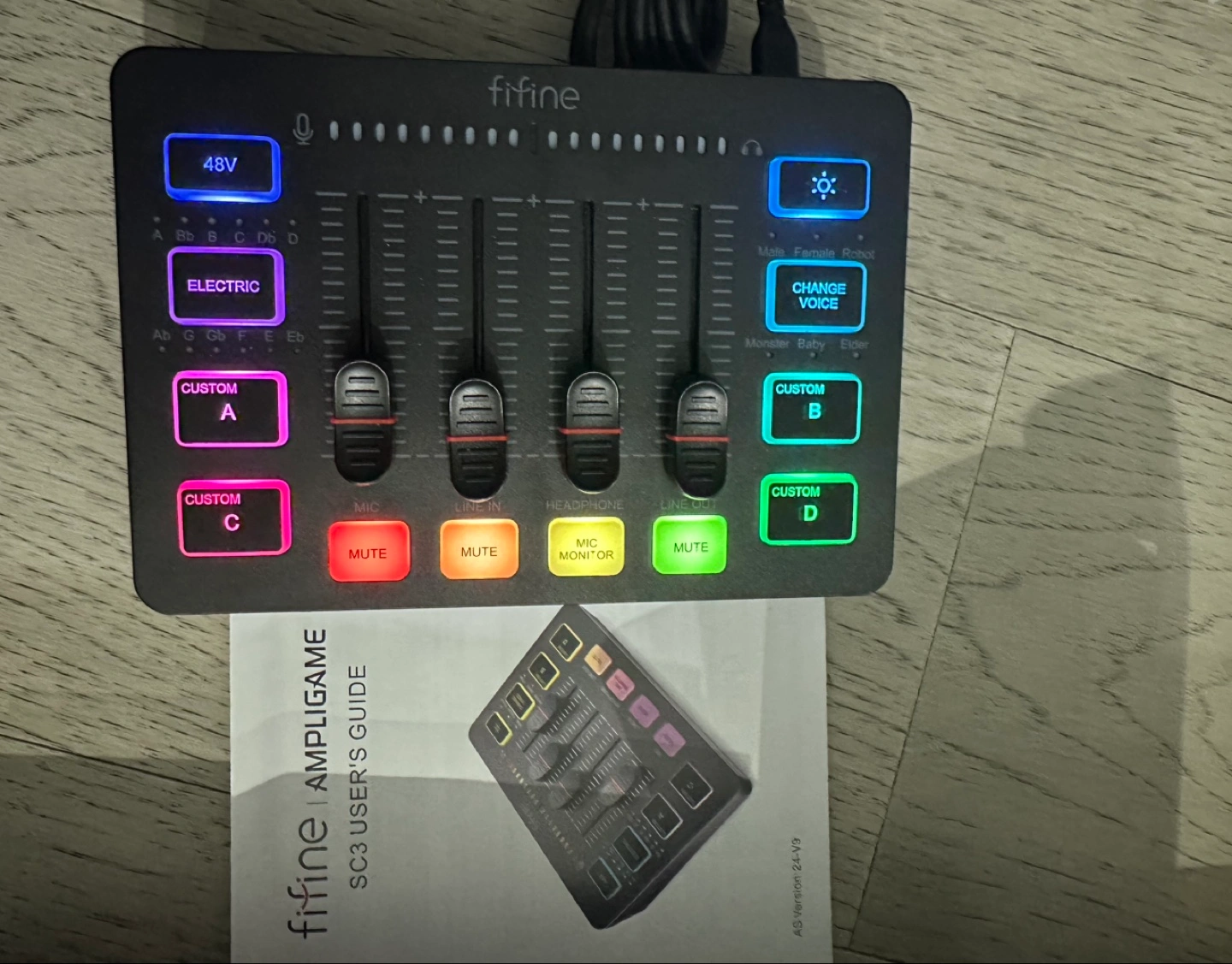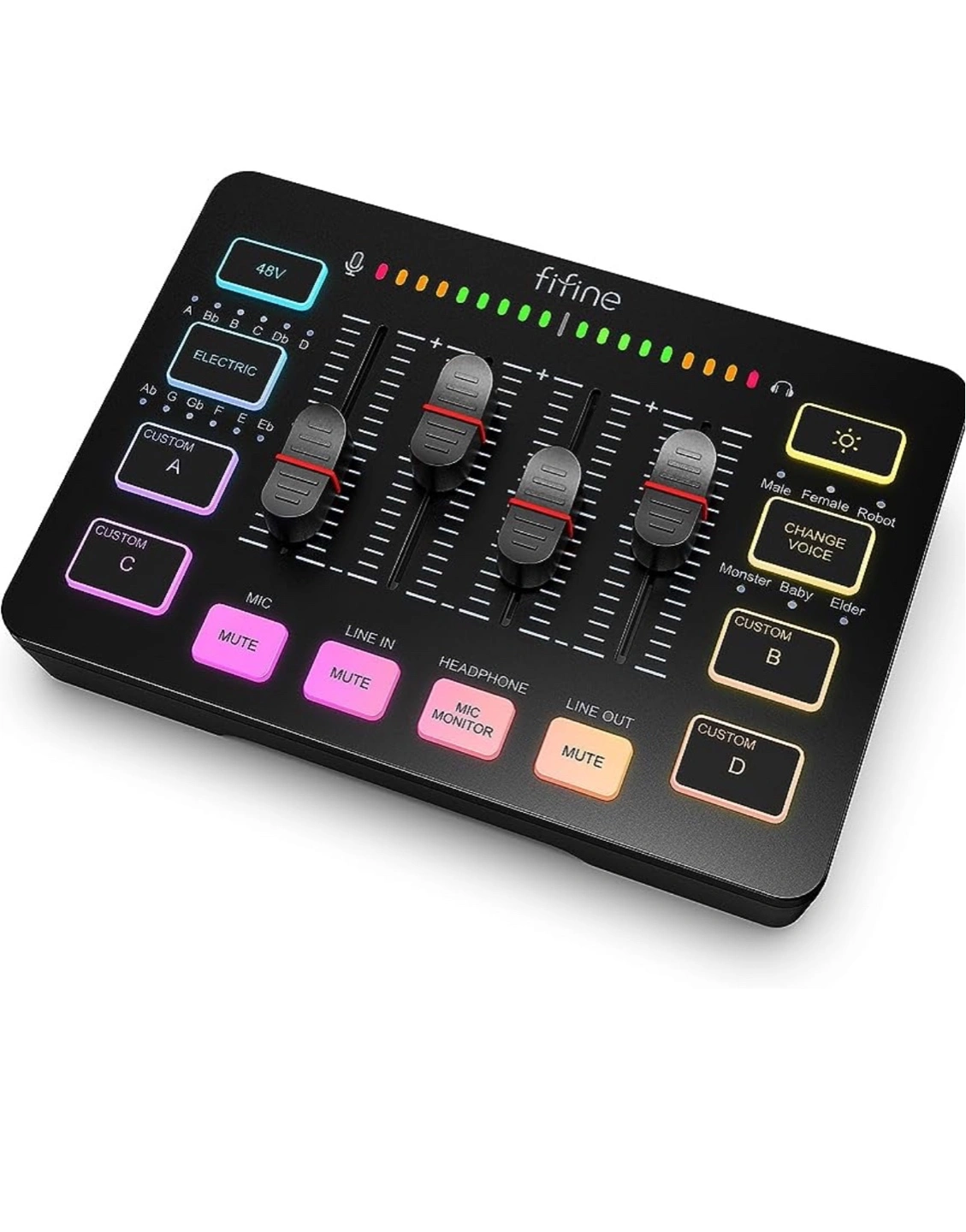 Four channel audio mixer. Includes XLR and 3.5mm inputs. Multiple voice changing effects. Headphone and line out jacks. USB powered.