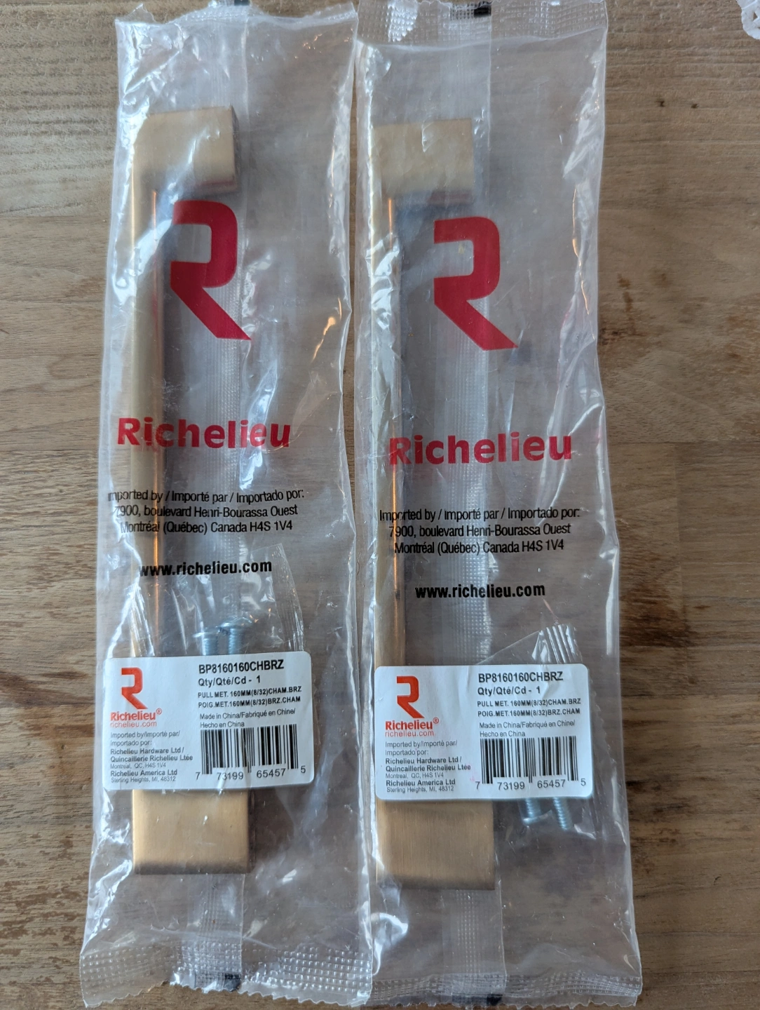 New in package. Two brushed bronze cabinet pulls. 160mm (6 5/16") centre-to-centre measurement.
