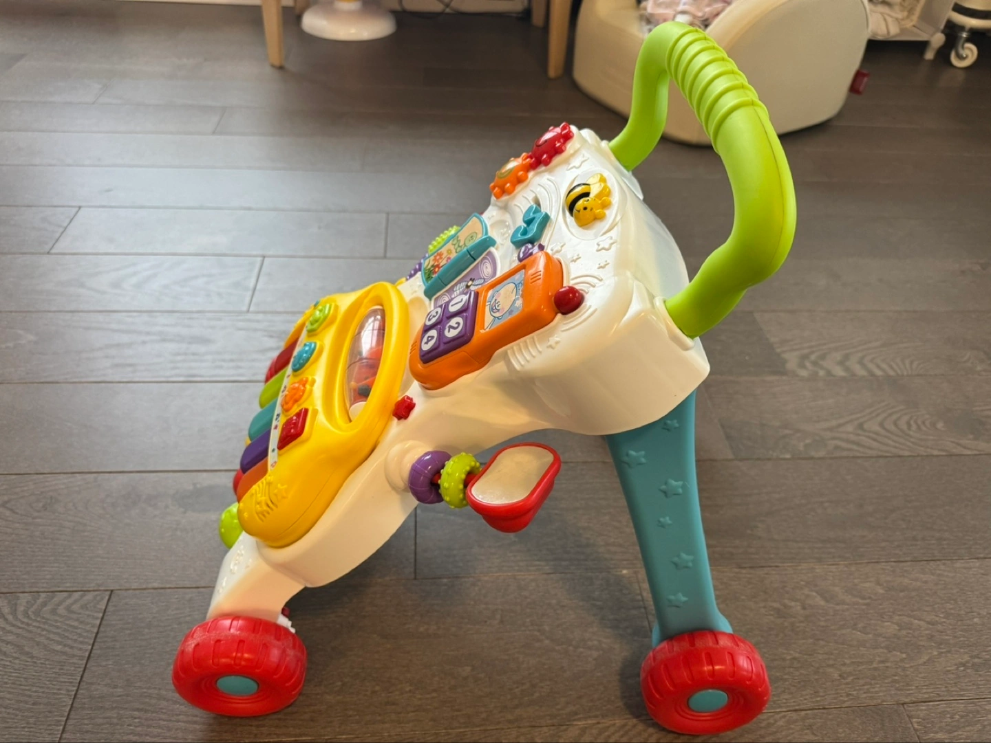 Fun and colourful baby walker. Features activity centre with lights and sounds. Multiple activities to stimulate baby's development. Great condition. Wheels roll smoothly.