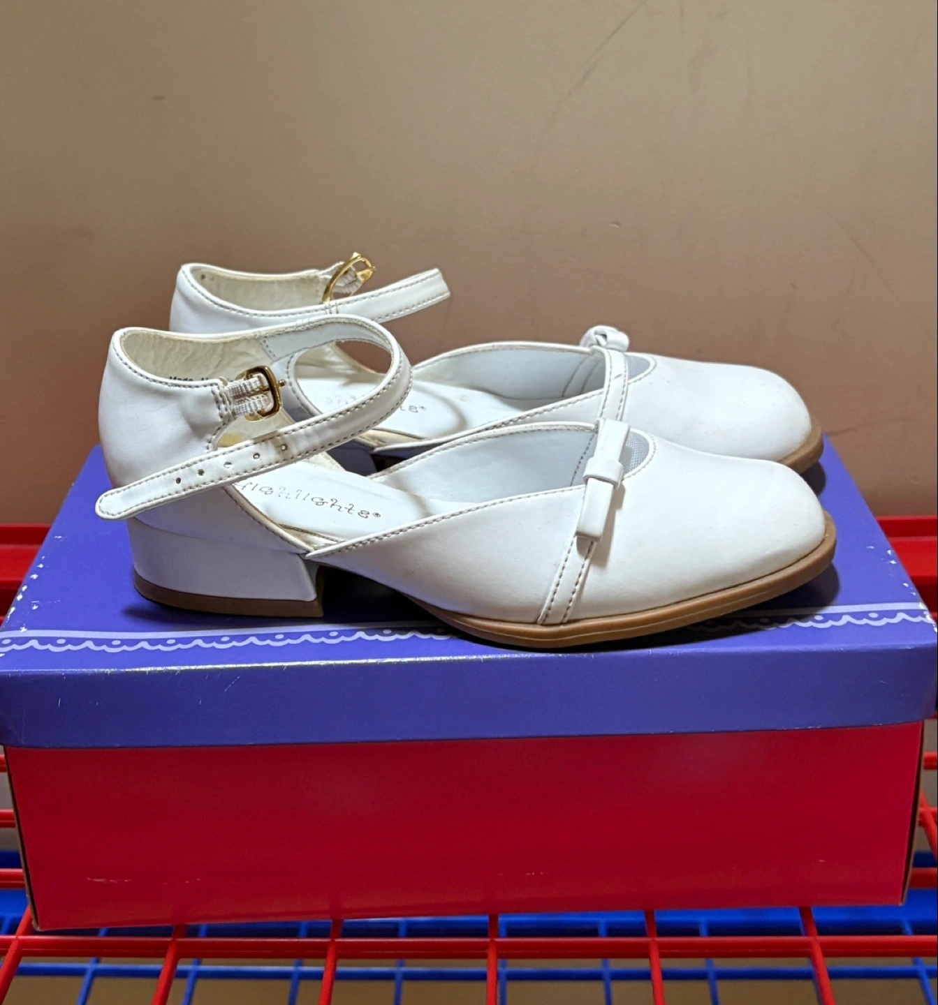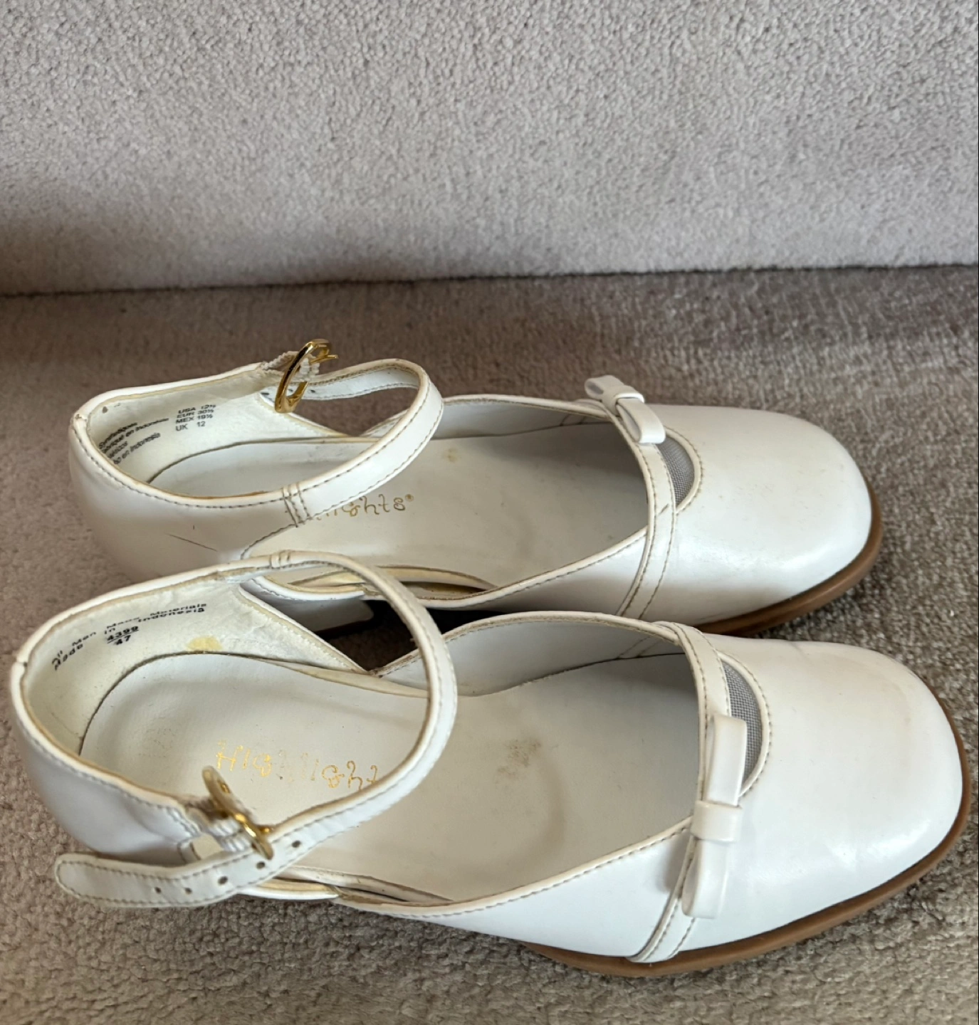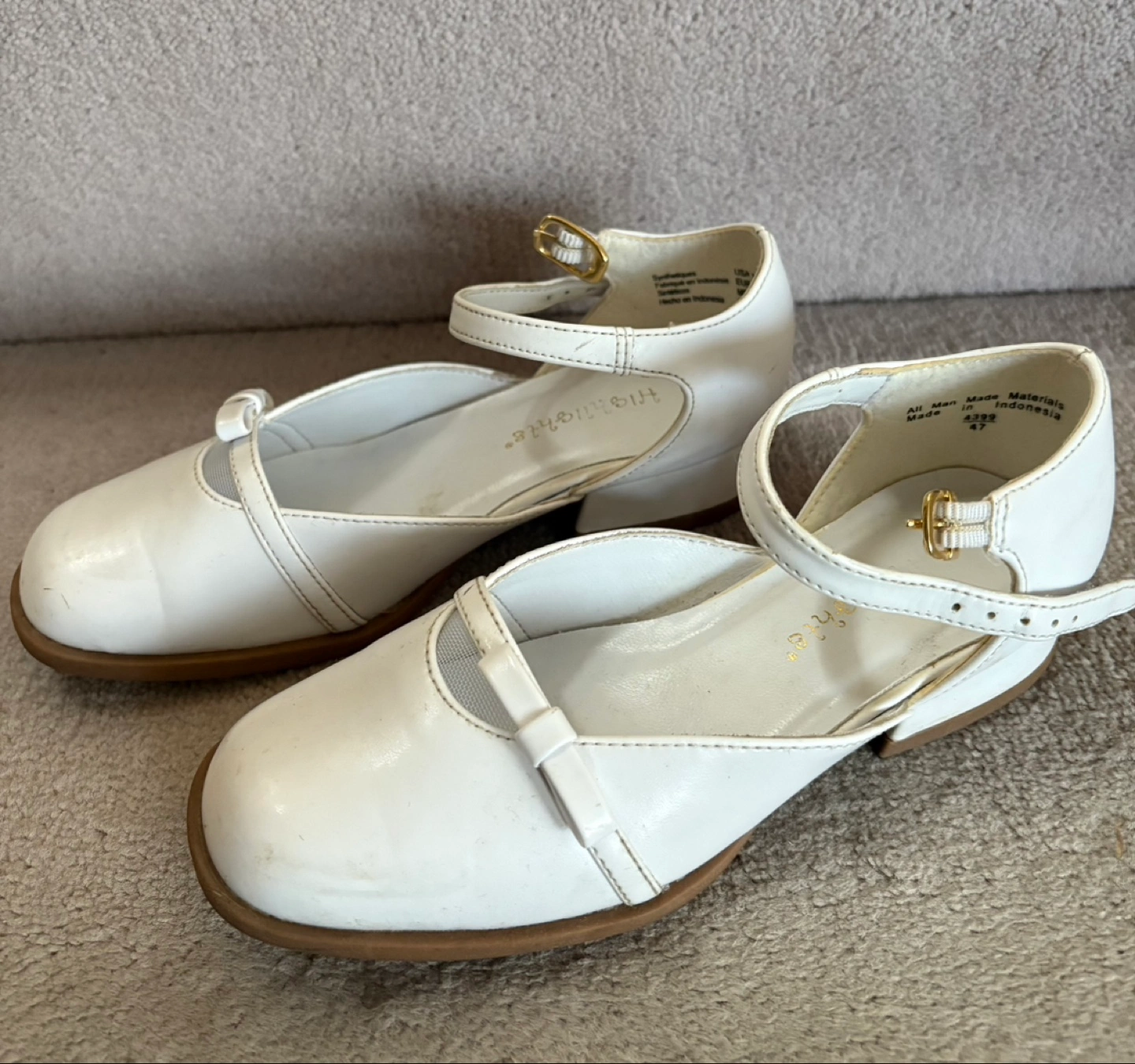 Adorable white leather Mary Jane shoes. Low block heel. Ankle strap with buckle closure. Small bows on the toe. Excellent for dressy spring occasions. In original box. Like new. Brand: Highlights. Size: 12.5