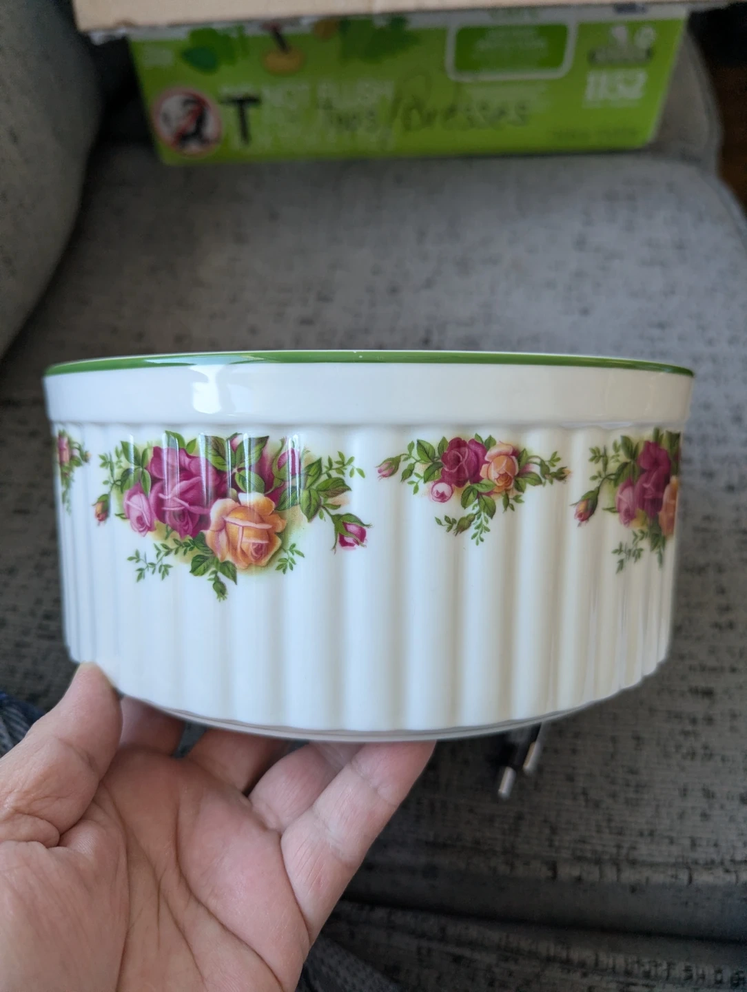 A small ceramic ramekin dish featuring the classic Old Country Roses floral pattern. It has a fluted design and a green trim along the rim. Oven-safe ceramic material.