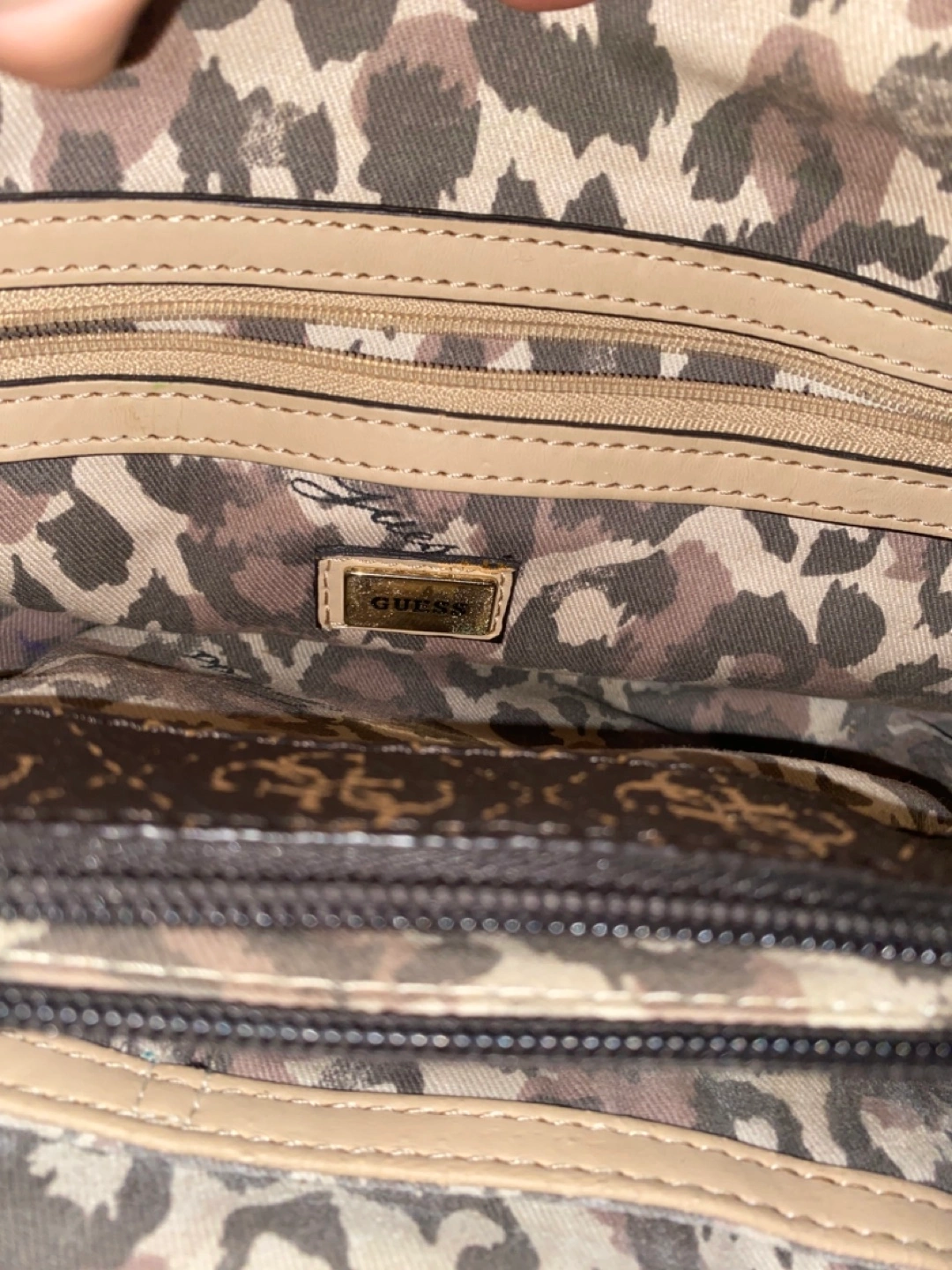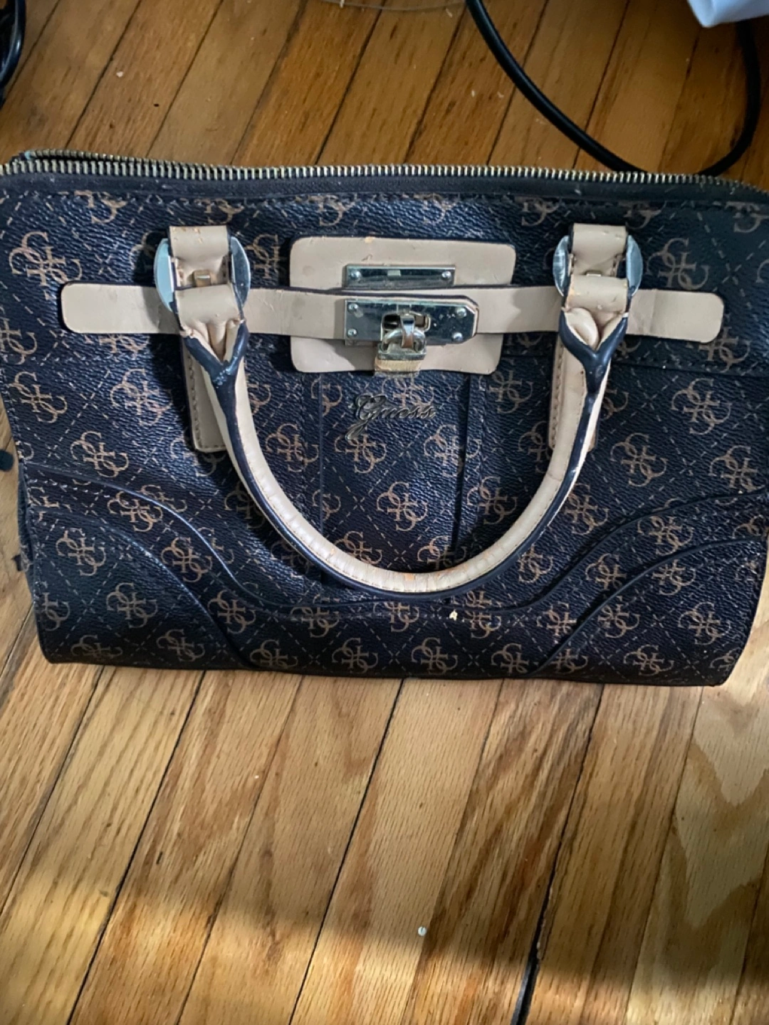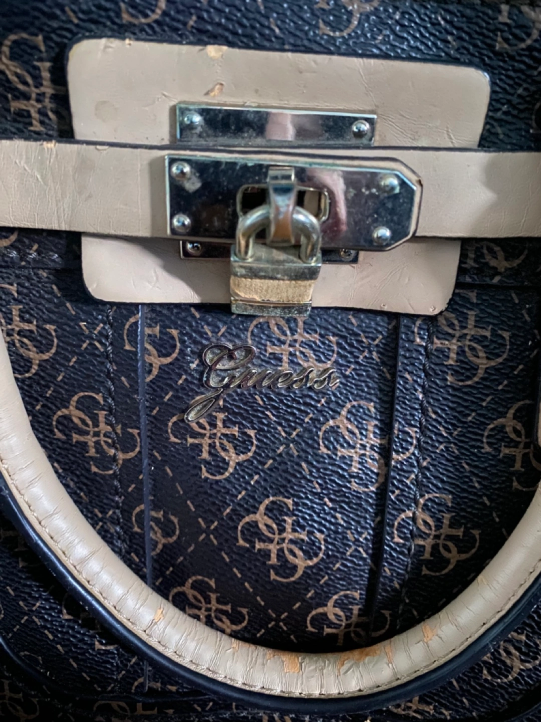Brown and beige Guess satchel. Top handle and zip closure. Some wear and tear visible.