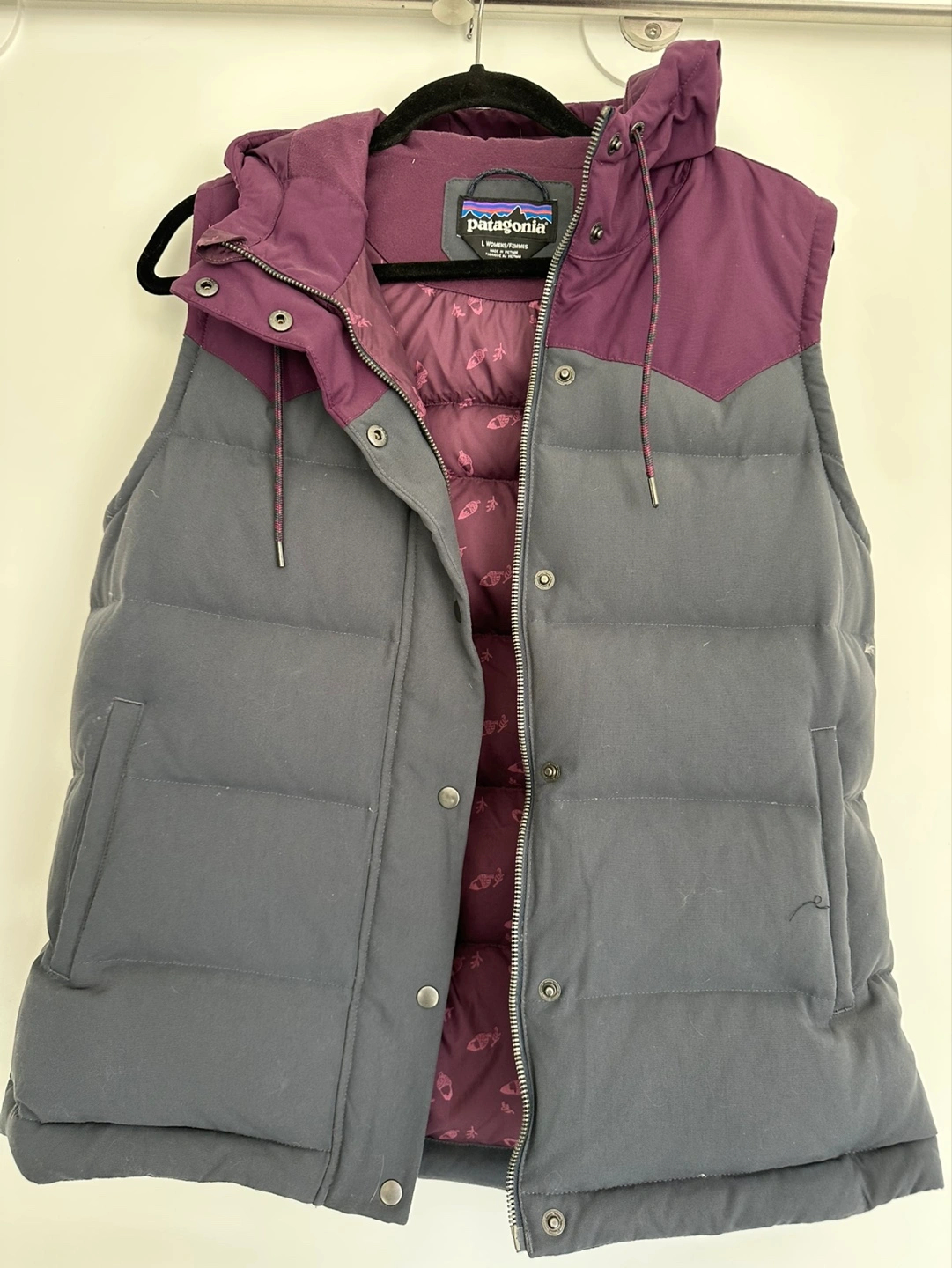 Women's Patagonia insulated vest. Colour-blocked design, dark grey and purple. Features a hood. Excellent for layering.