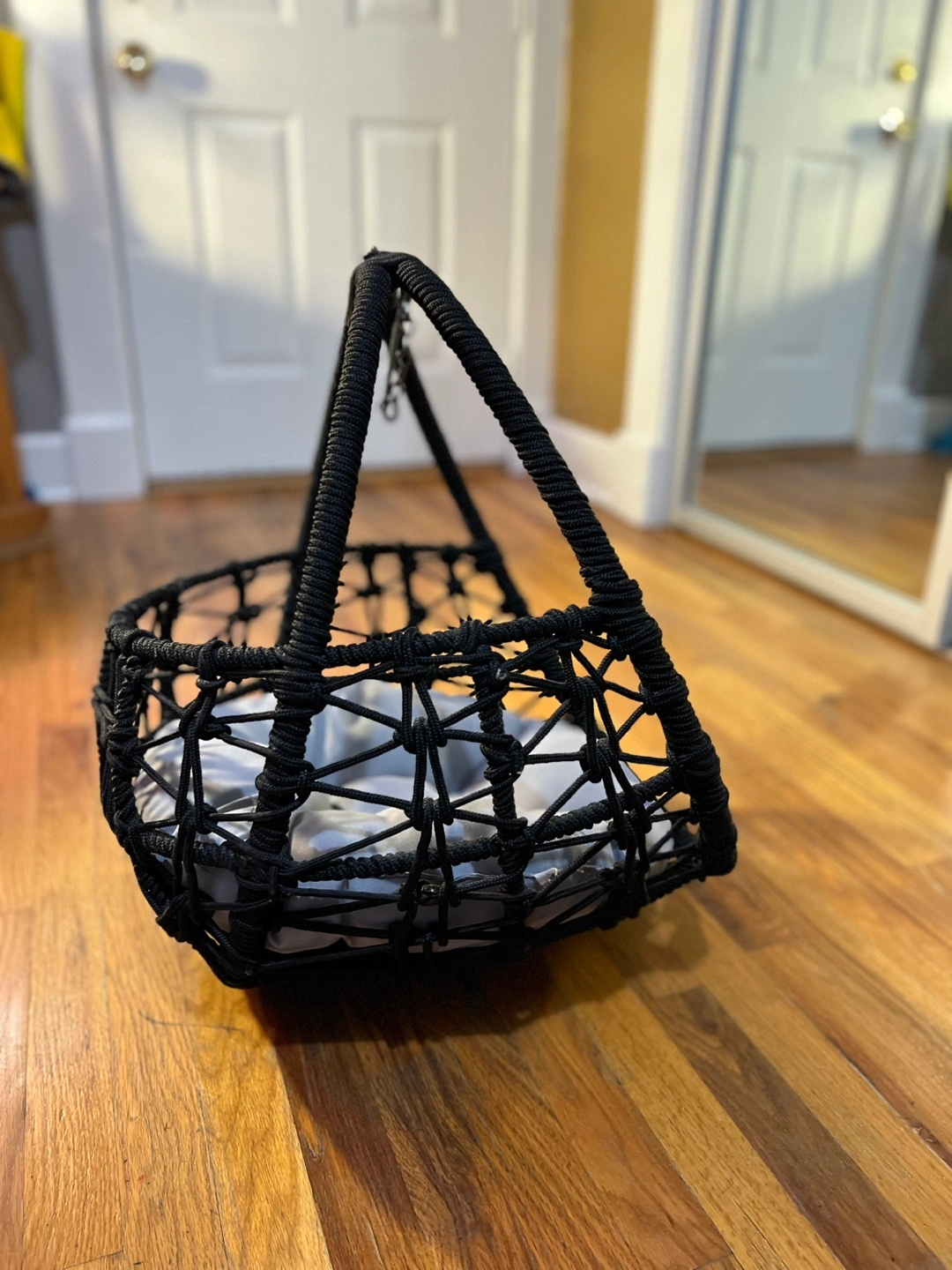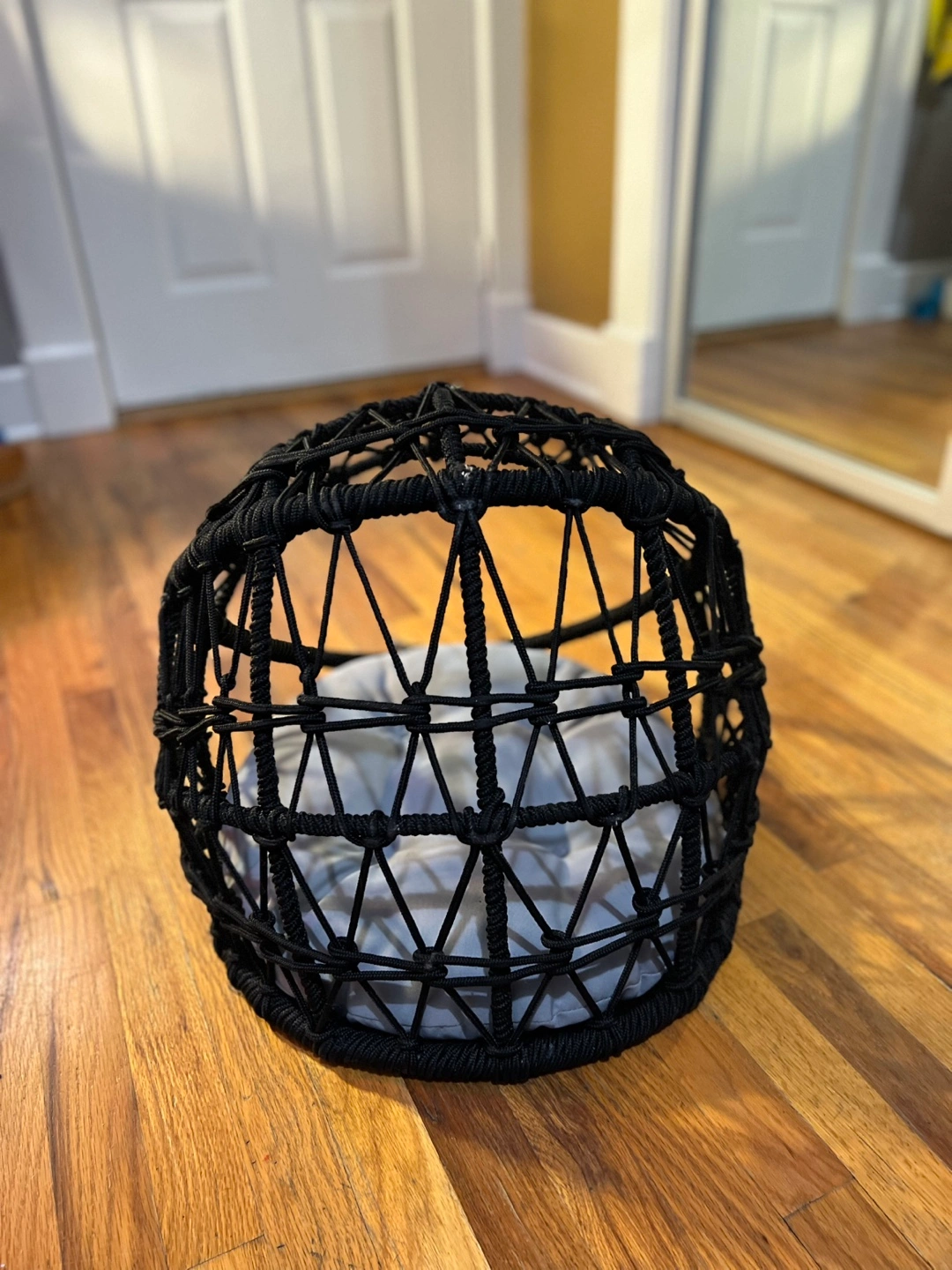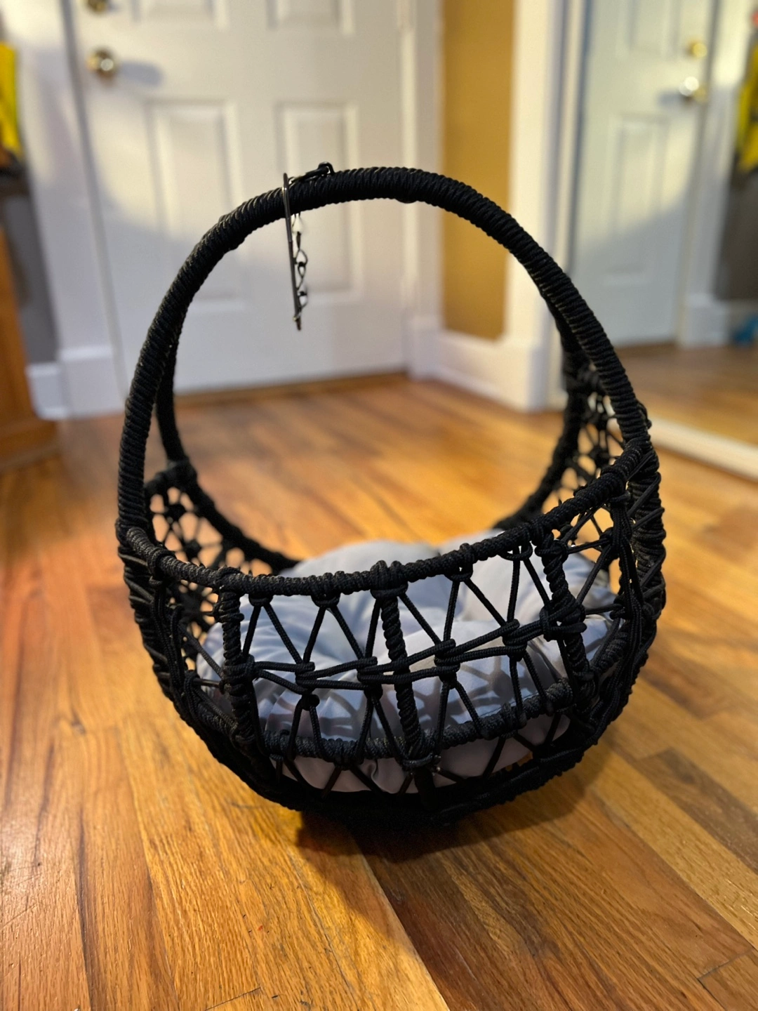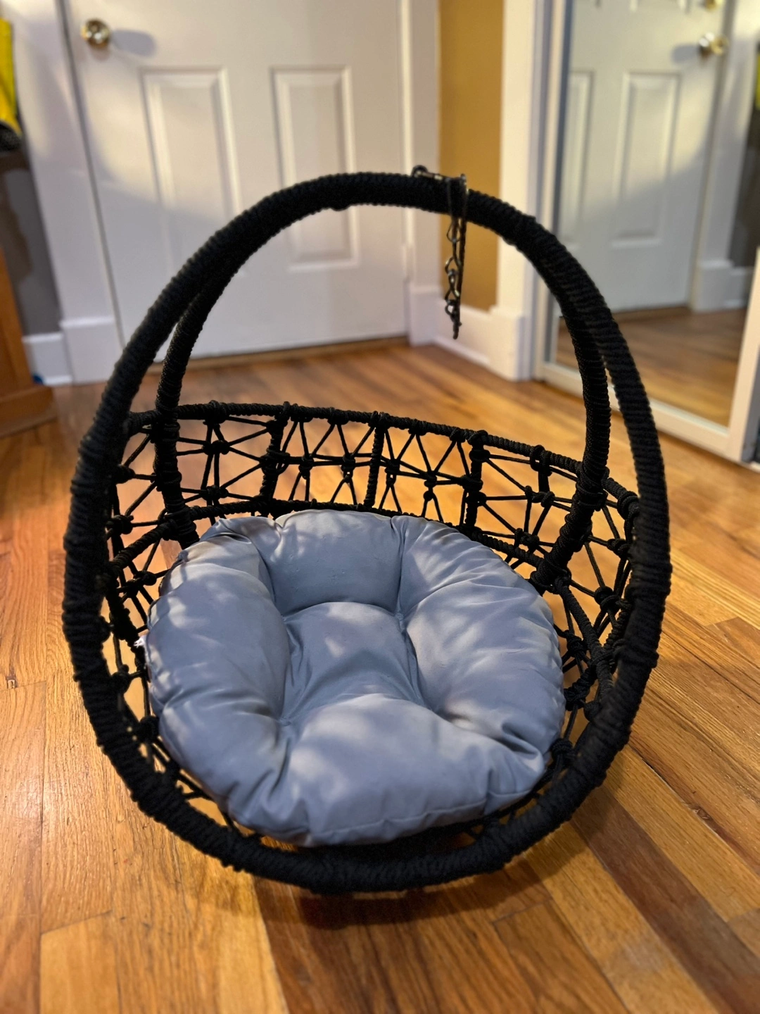 Hanging pet bed. Perfect for small cats or dogs. Includes a gray cushion. Great for outdoor/indoor use. Unique design. Stand not included. A hook was used to hang instead of stand. Great for pet relaxation.