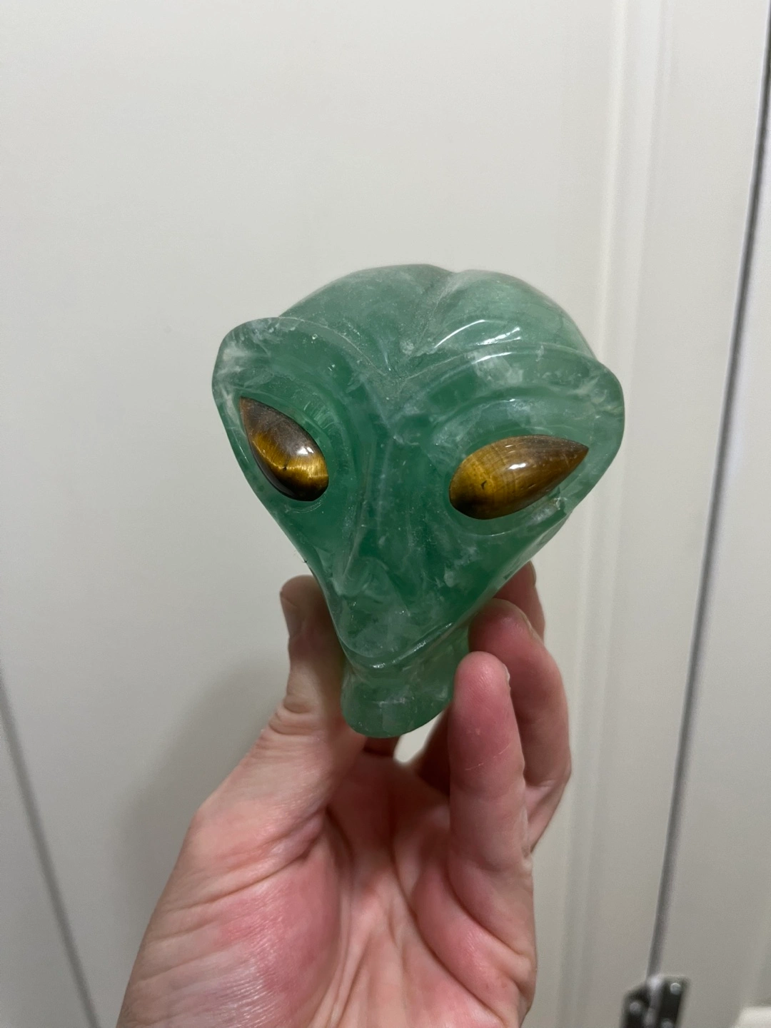 Hand-carved, High Quality green fluorite alien head. Features tiger eye inlay for eyes. Unique collectible, great for display. Approximately 4 inches tall. Rainbow π on the back of his head !