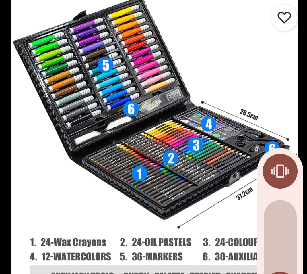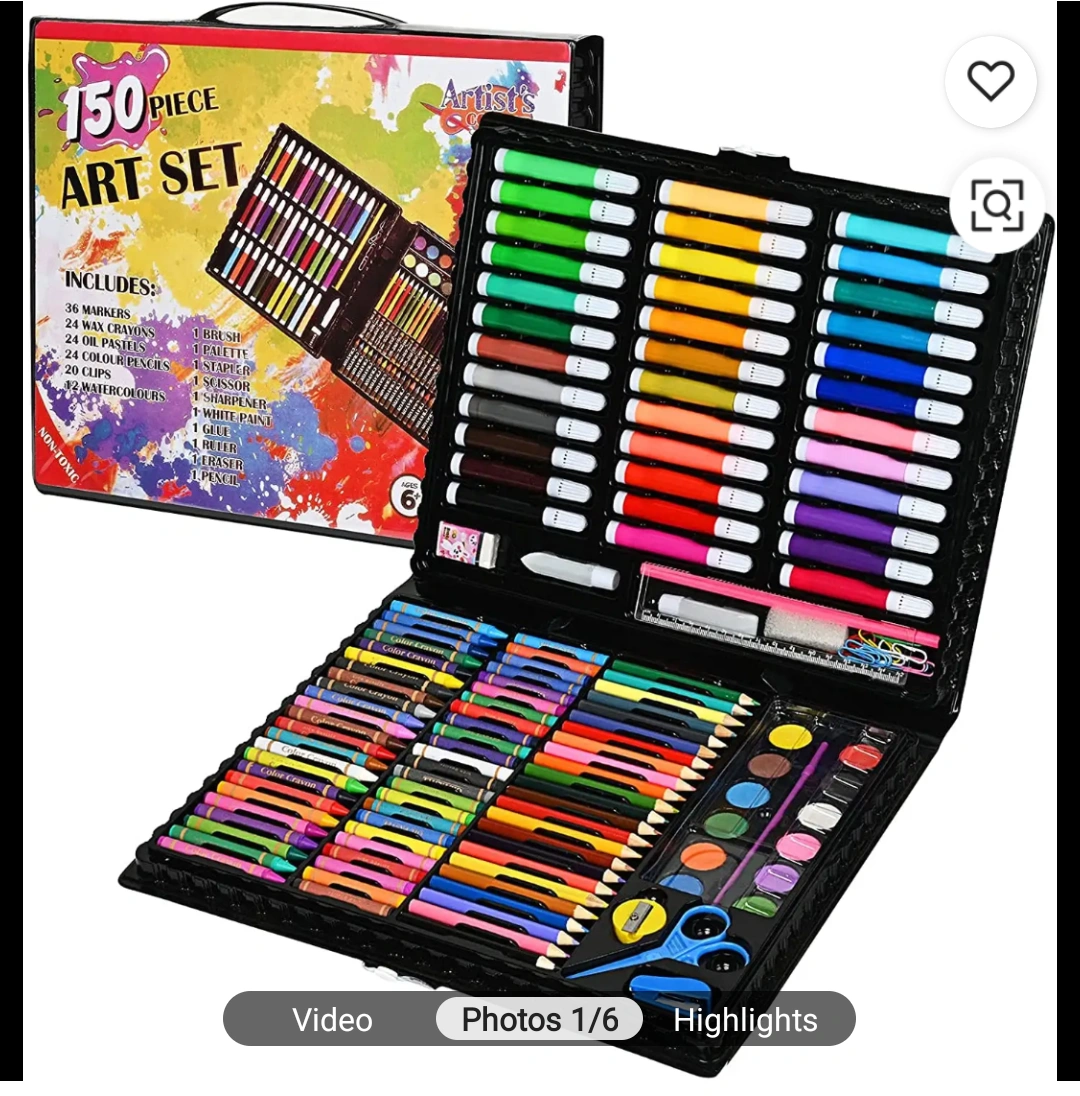Large art set, perfect for kids. Includes crayons, markers, pastels, watercolours, pencils, and more. Convenient carrying case. Great for school or home use. 6 set available