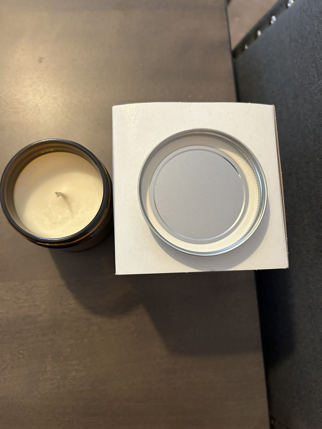 8oz amber glass jar candle. Citrus Glow scent. Gold lid. Inspirational quote on jar. New, unused. Comes with a white gift box.