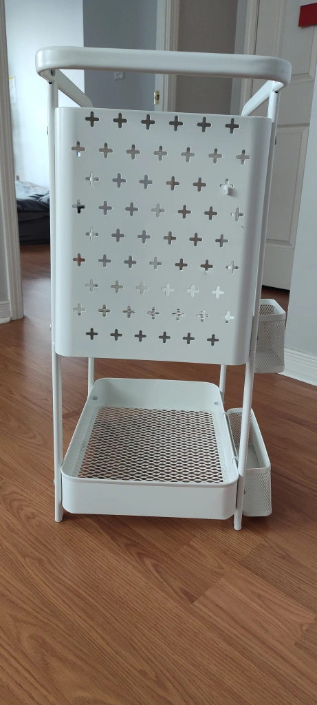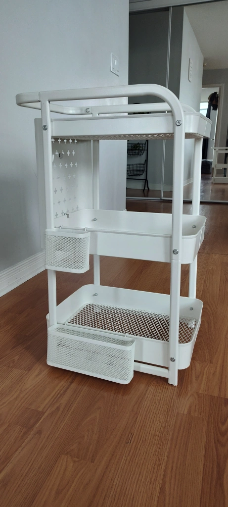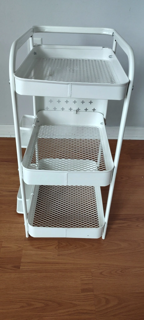 1000+Three-tier rolling cart. White metal frame. Mesh shelves. Small side storage baskets. Great for organization. Overall dimension : 20.5" x 13" x 29.5"(L x W x H) Net weight : 12 lbs Static weight capacity of each shelf : 44 lbs