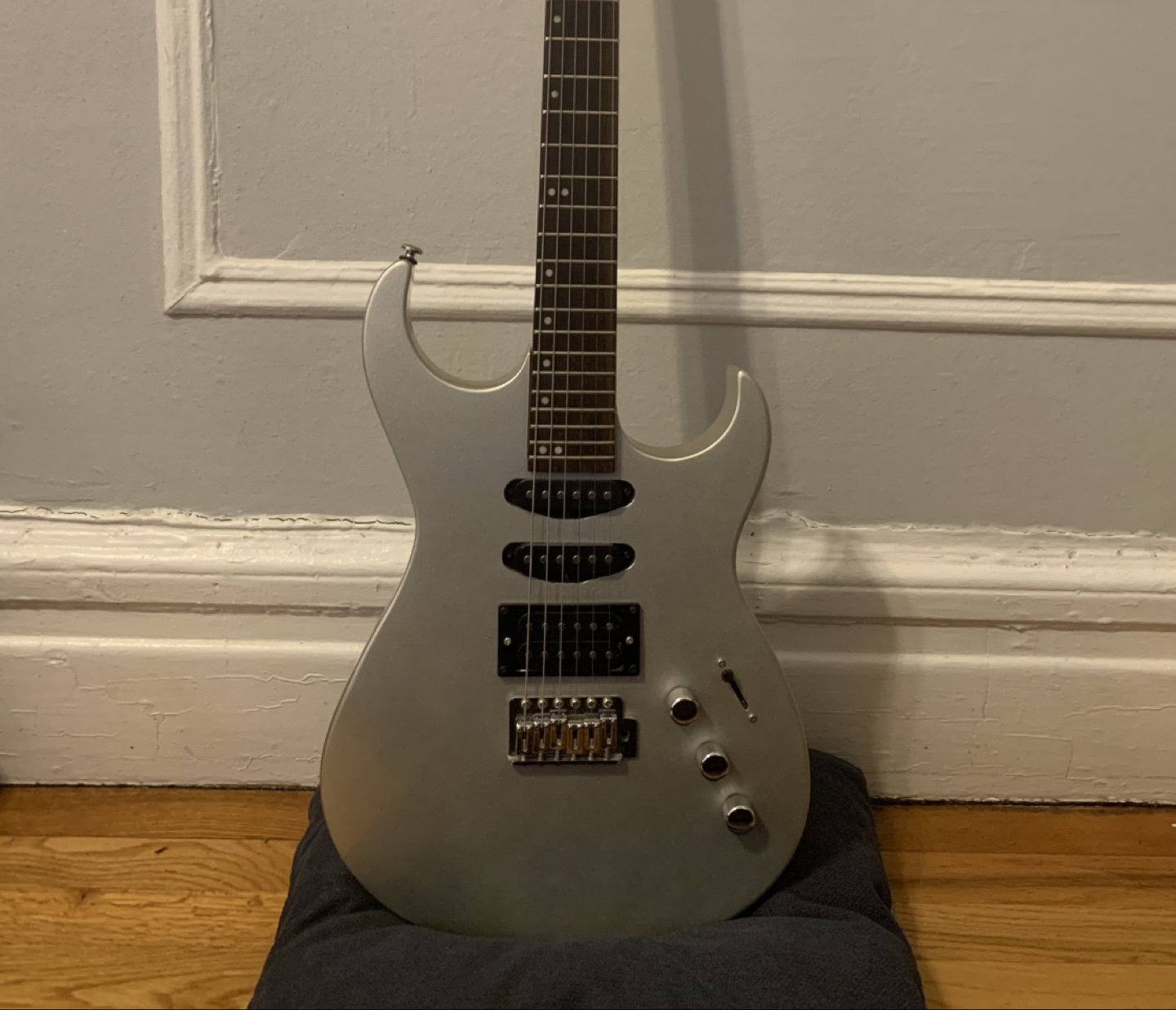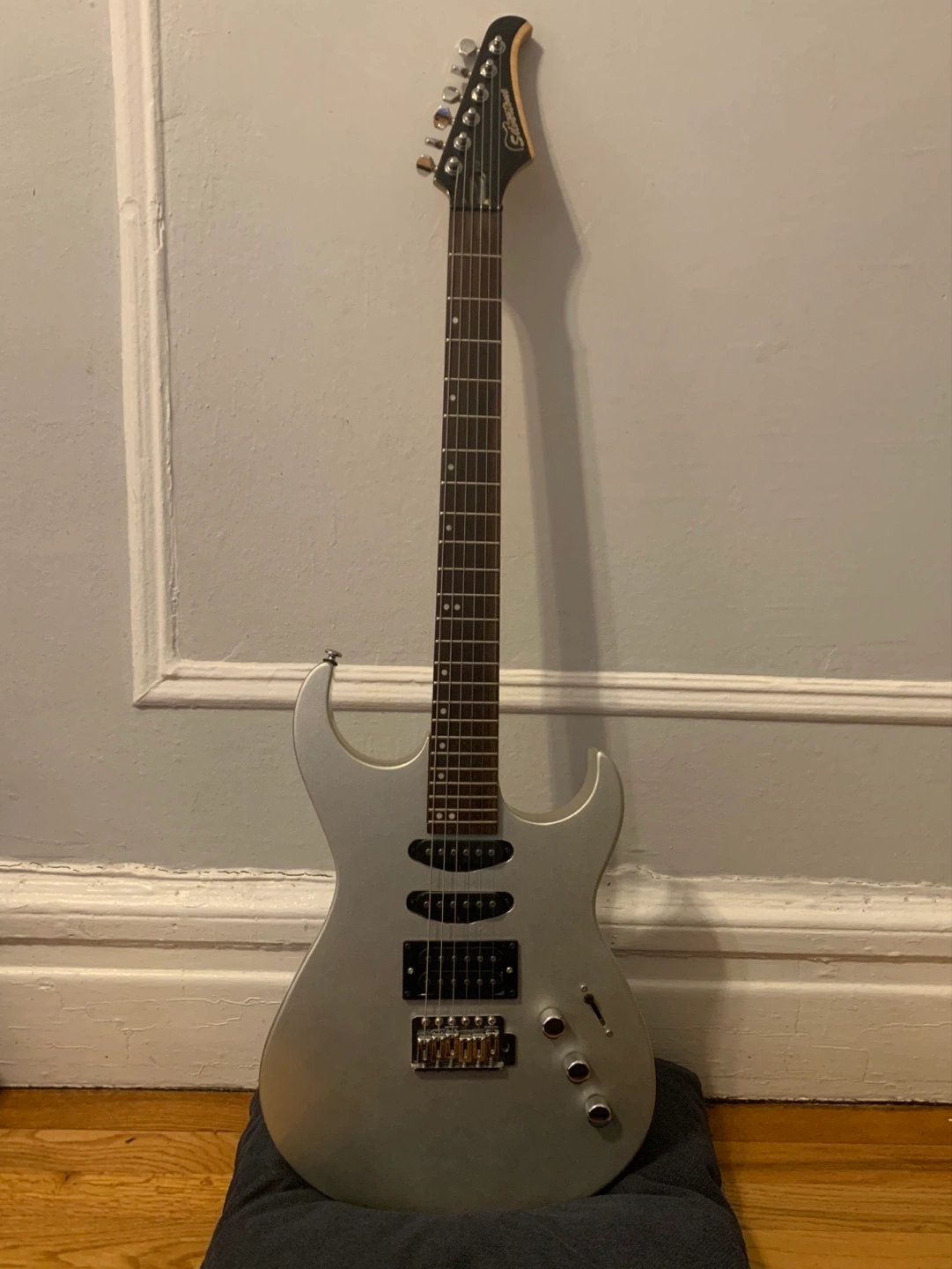 Solid body electric guitar. Silver finish. Six strings. Includes knobs and pickups.