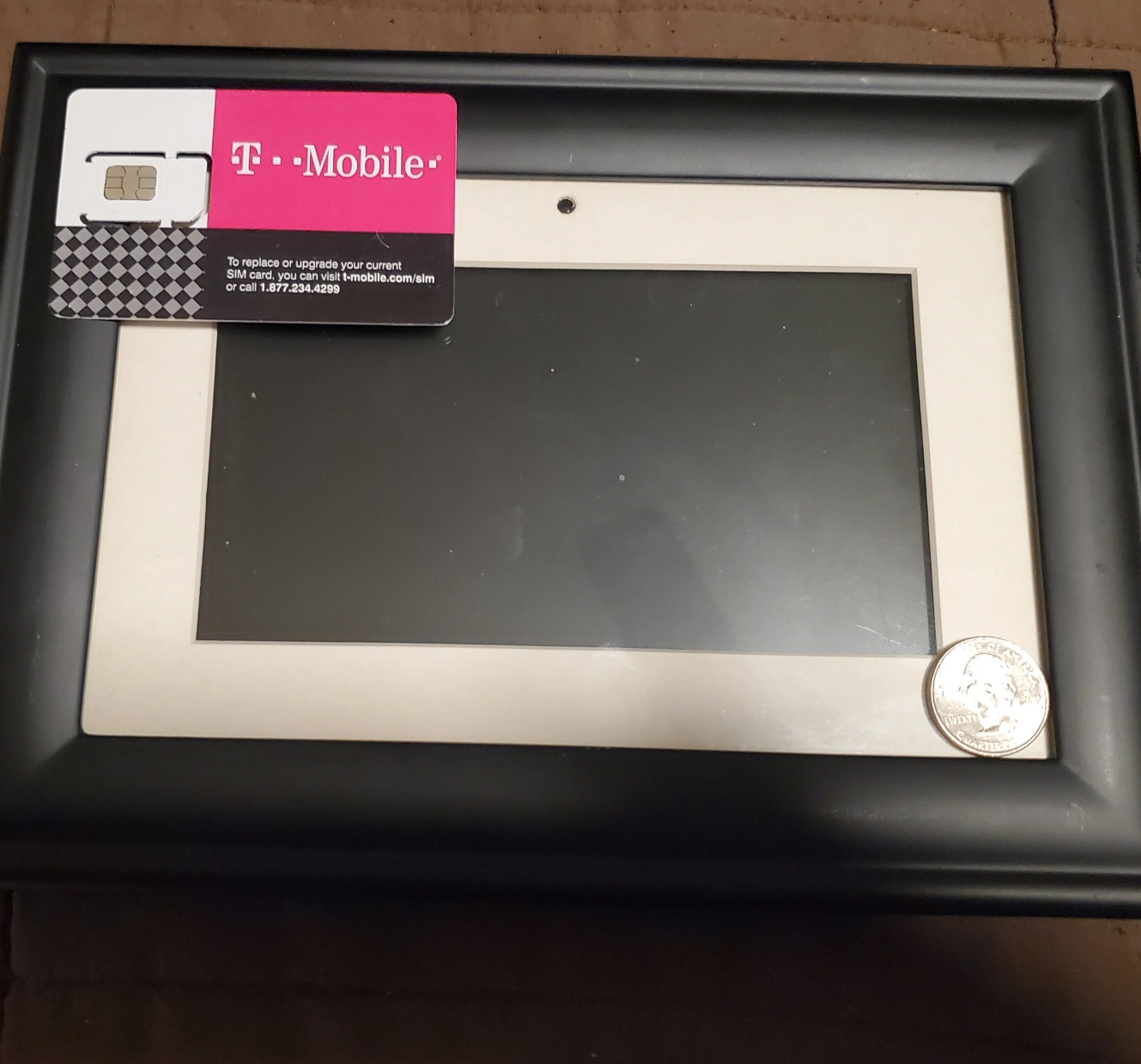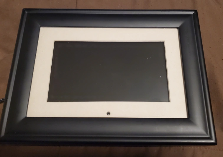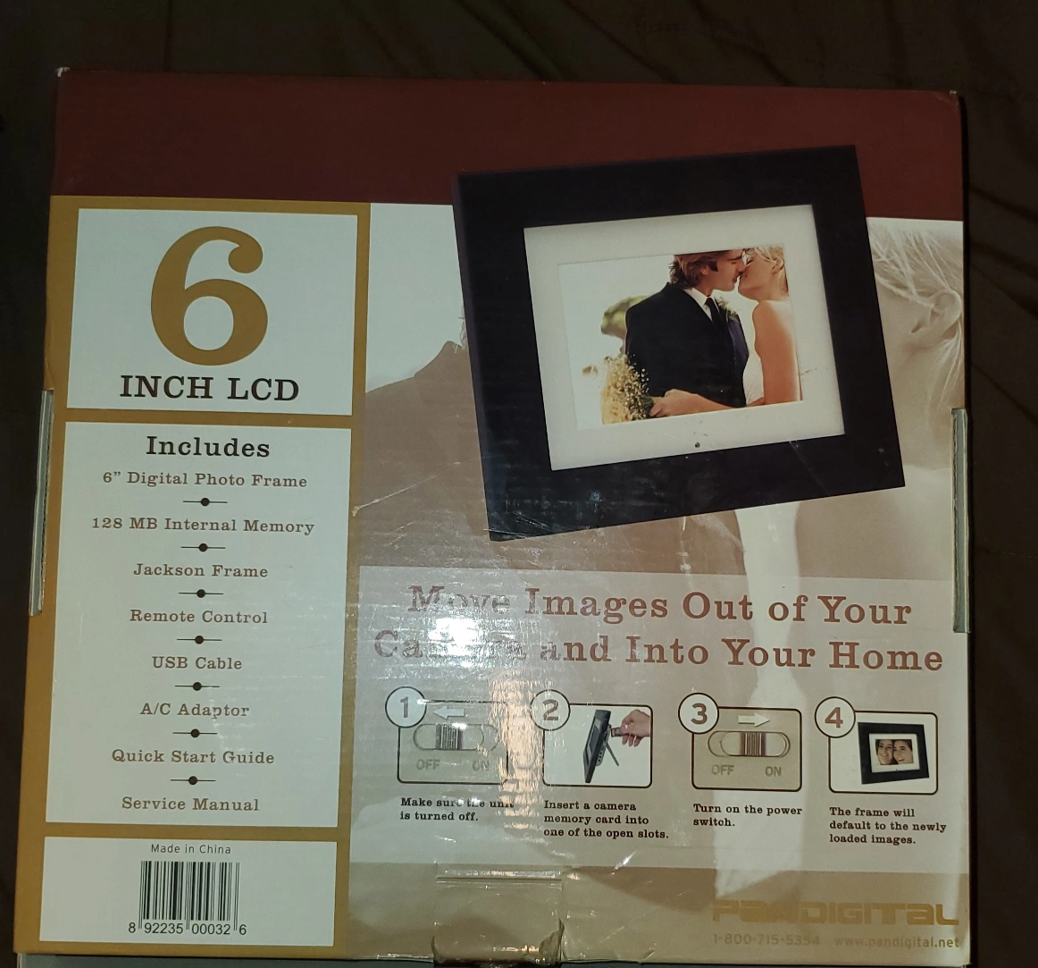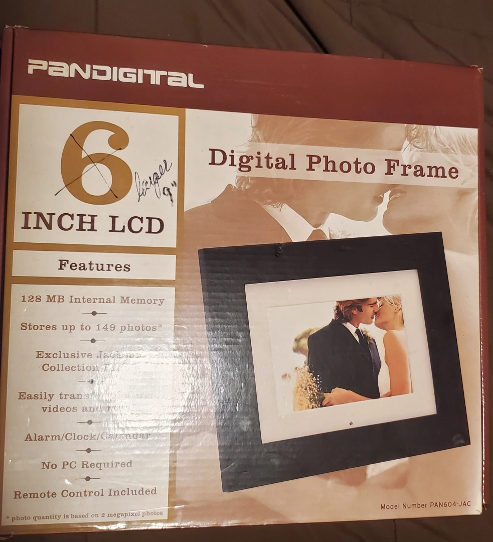 Pandigital digital photo frame. 6-inch LCD screen. Stores up to 149 photos. Includes remote control, power adapter, and user's guide. Black and brown frames