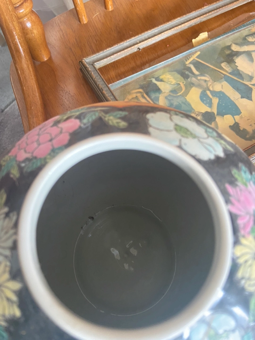 Beautiful vintage jar. Features floral and figural designs. Black background. Round shape with a fitted lid. Hand-painted details. Collectible piece.
